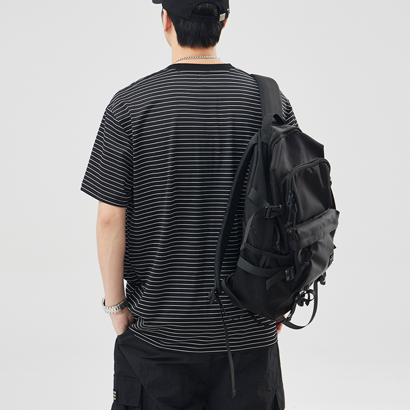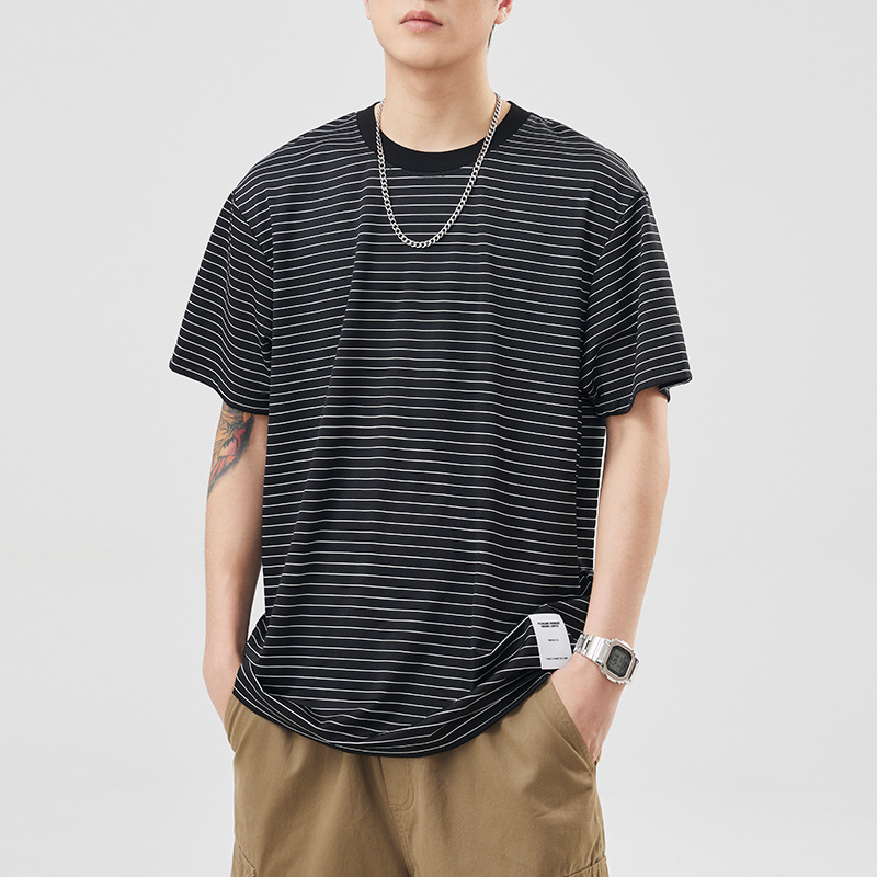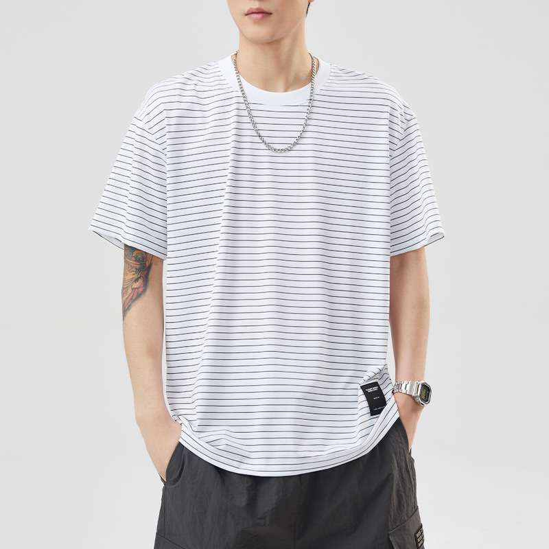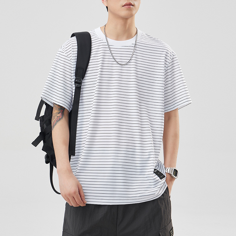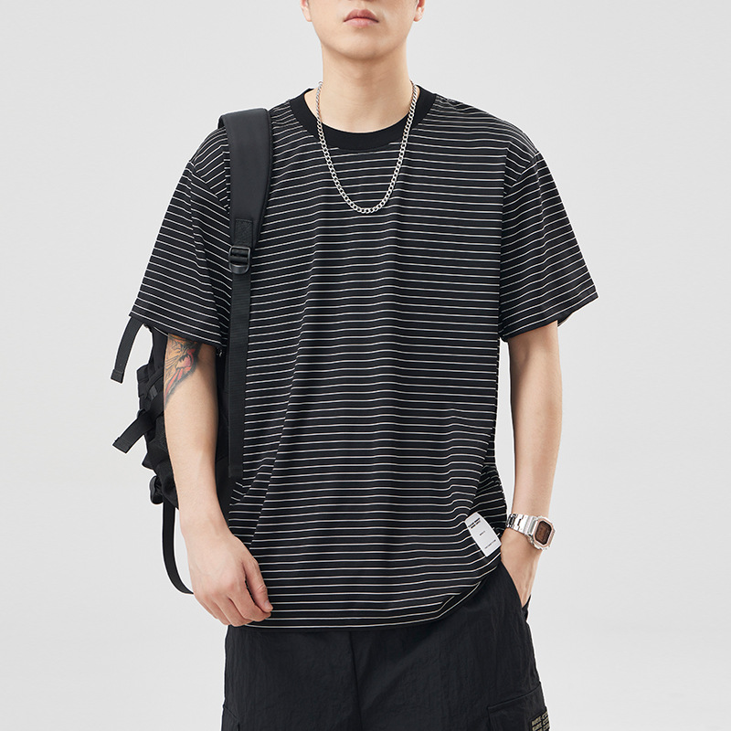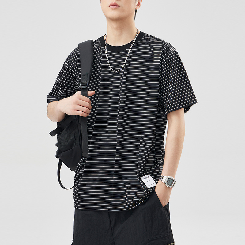 黑白条纹拼接圆领短t恤男士夏季冰丝速干运动上衣宽松半袖体恤男