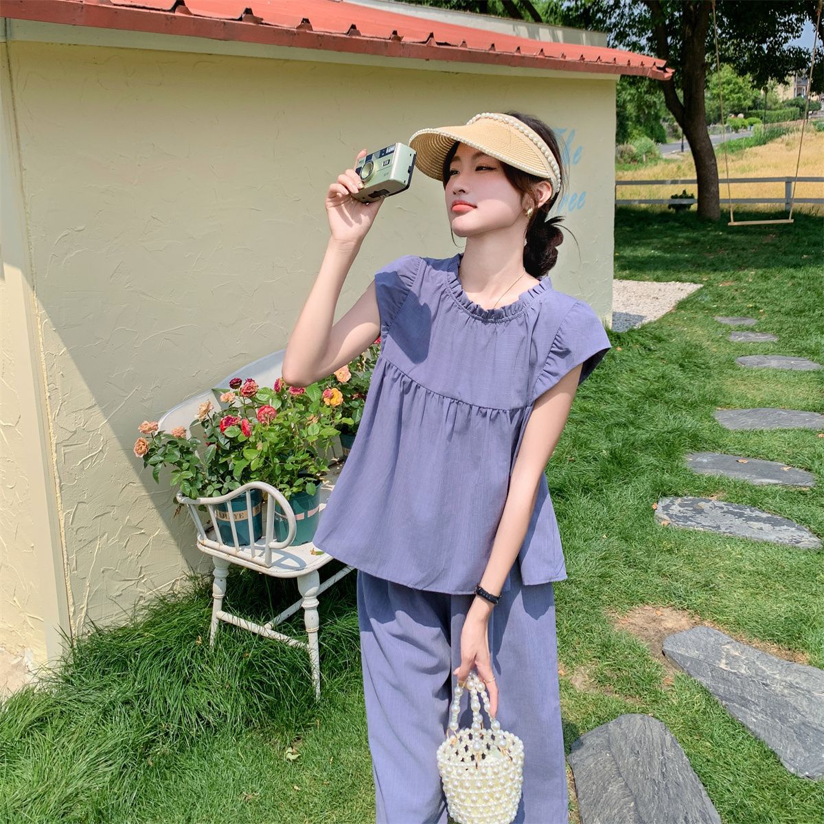 紫色欧货减龄套装女夏季新款法式小飞袖上衣直筒阔腿裤两件套
