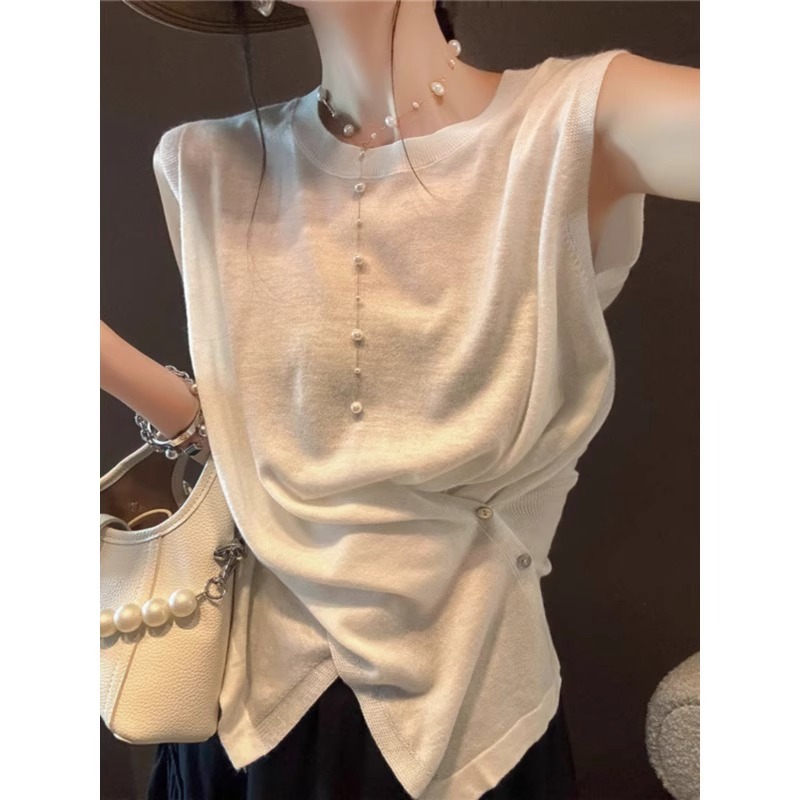 韩系轻熟风无袖圆领针织短袖上衣夏季新款不规则短款背心女