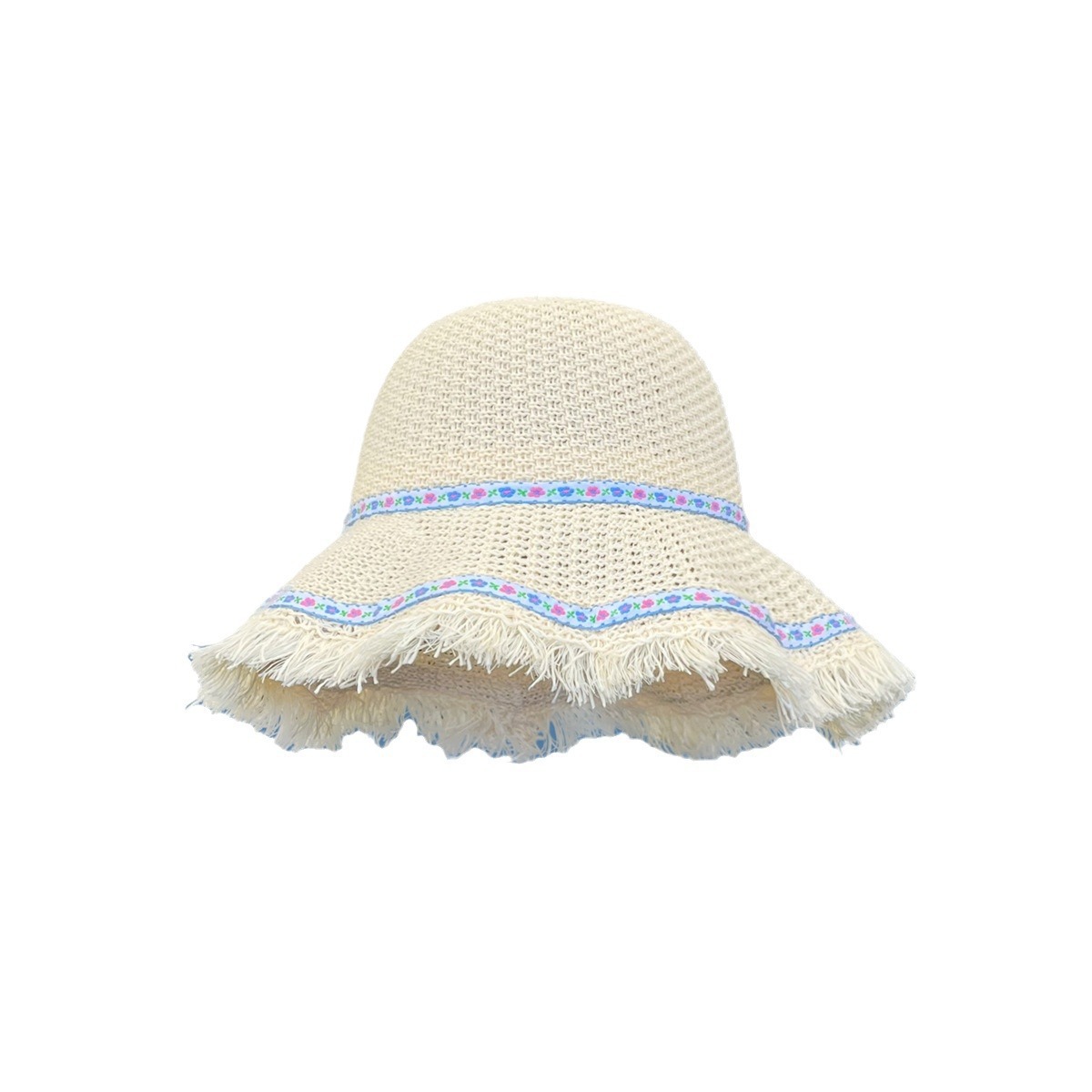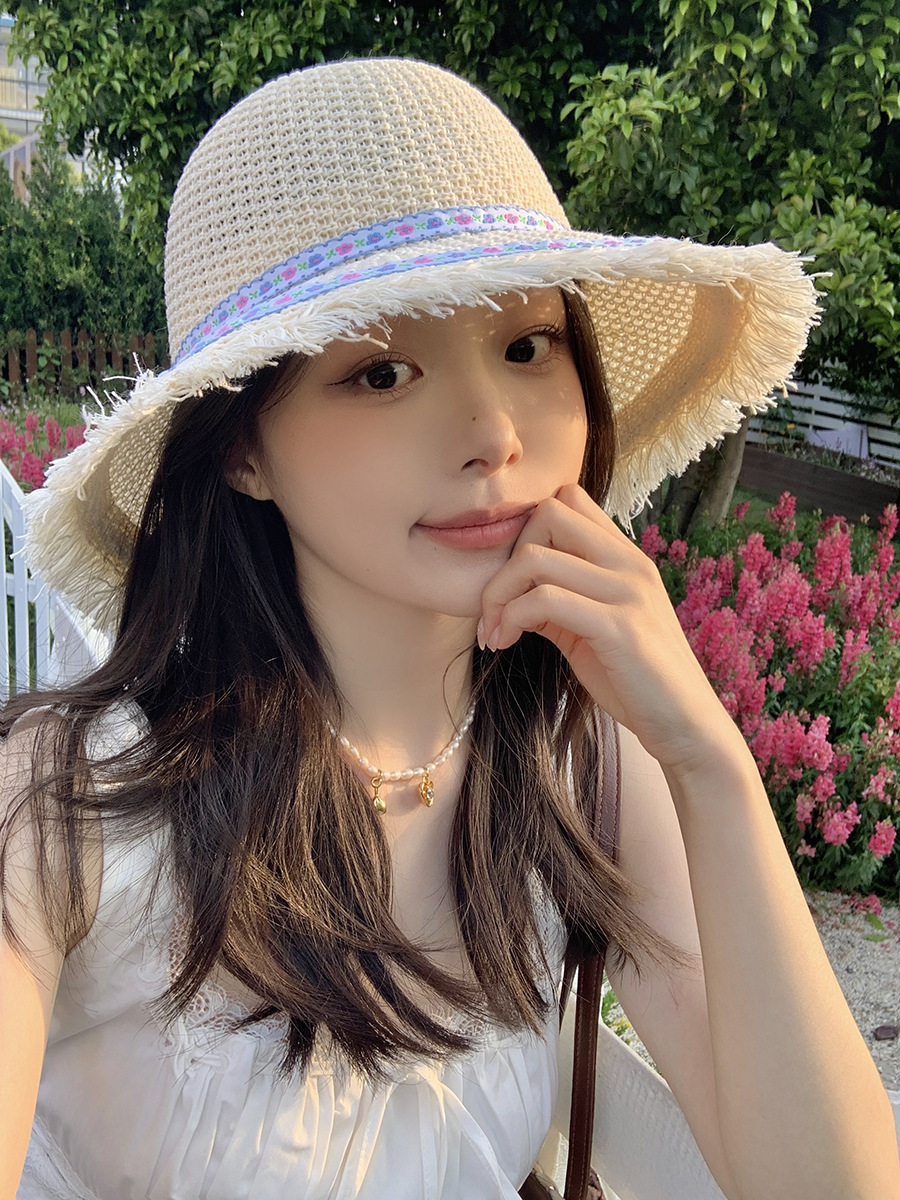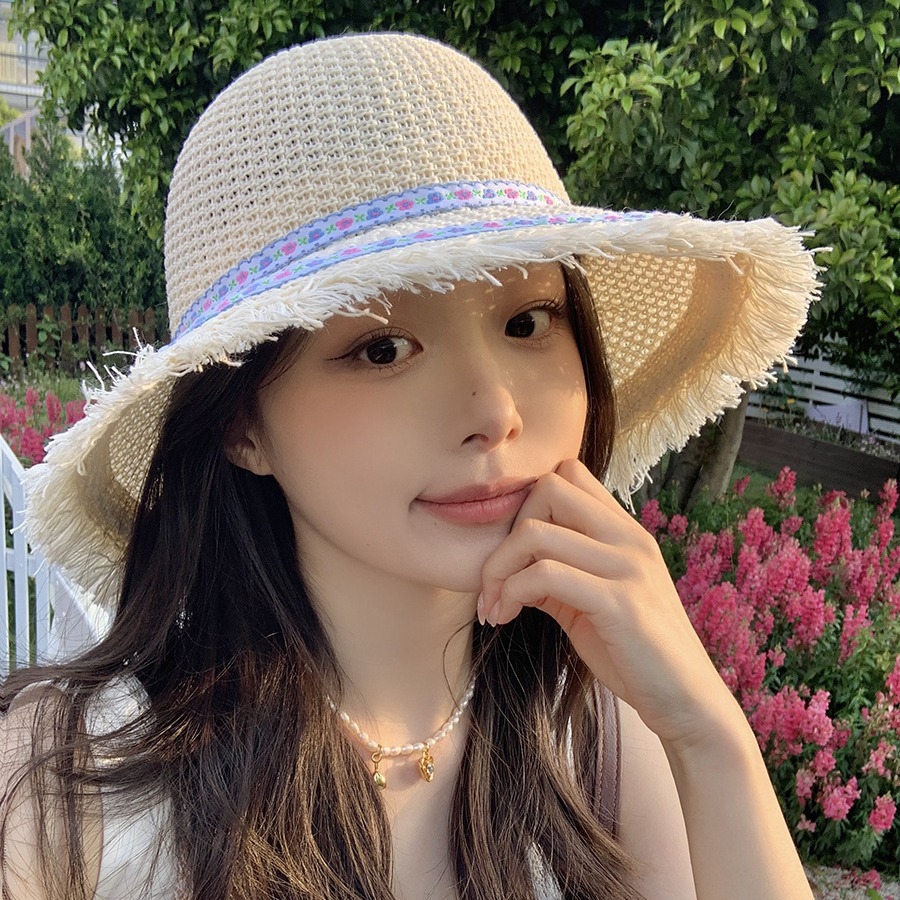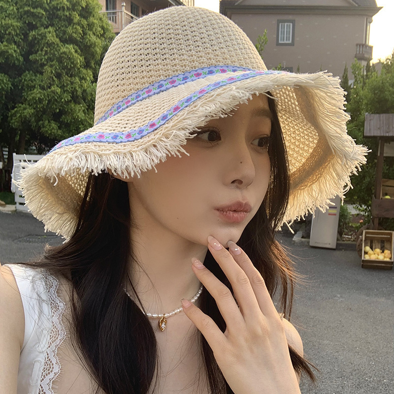 田园风花朵毛边大檐遮阳草帽夏季女海边沙滩度假镂空防晒太阳帽子