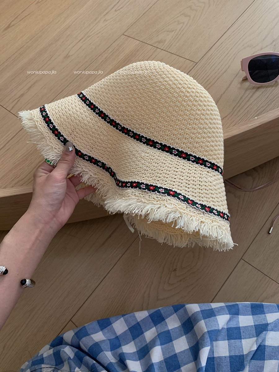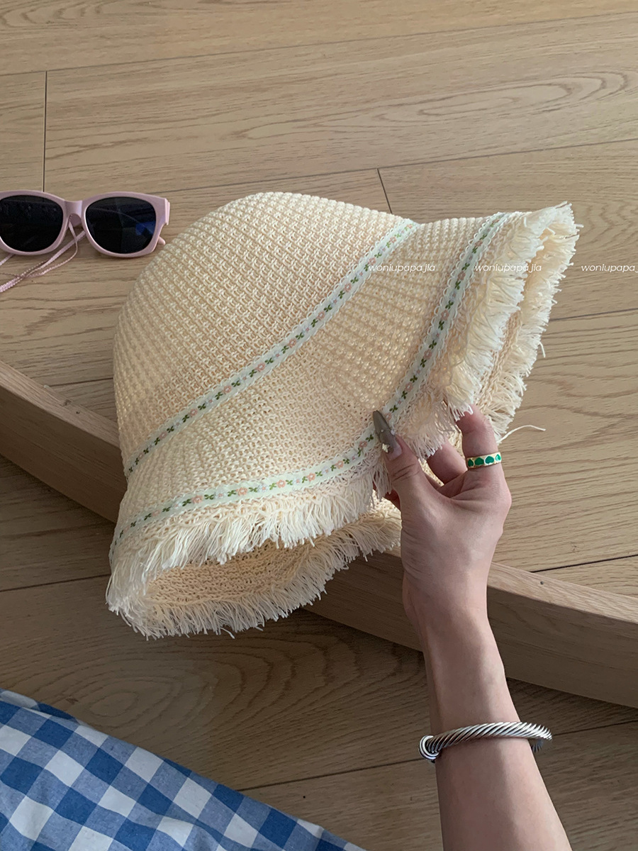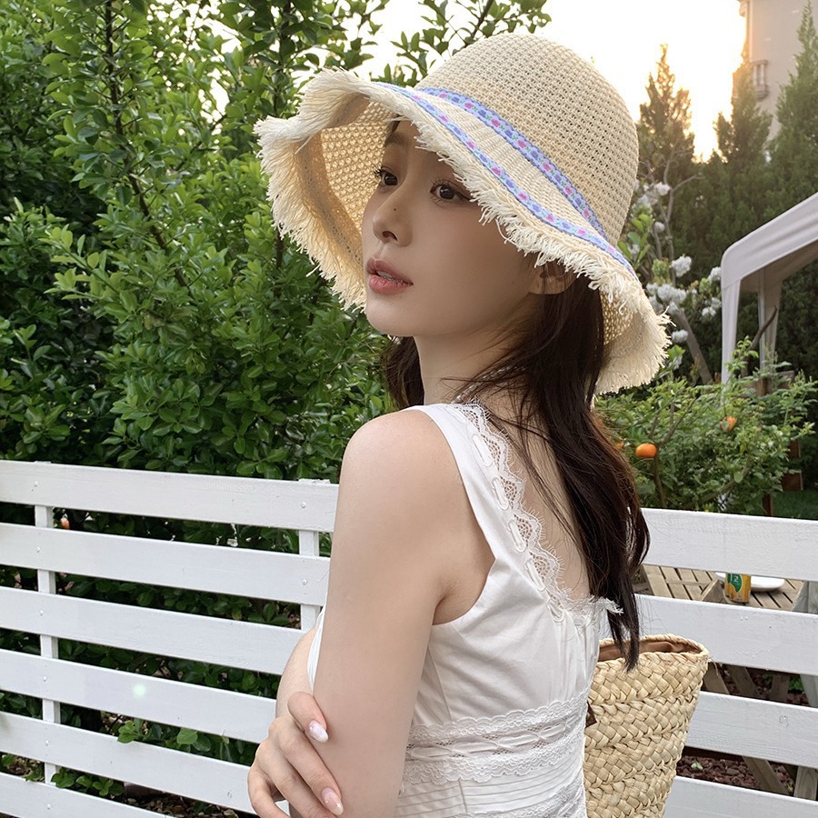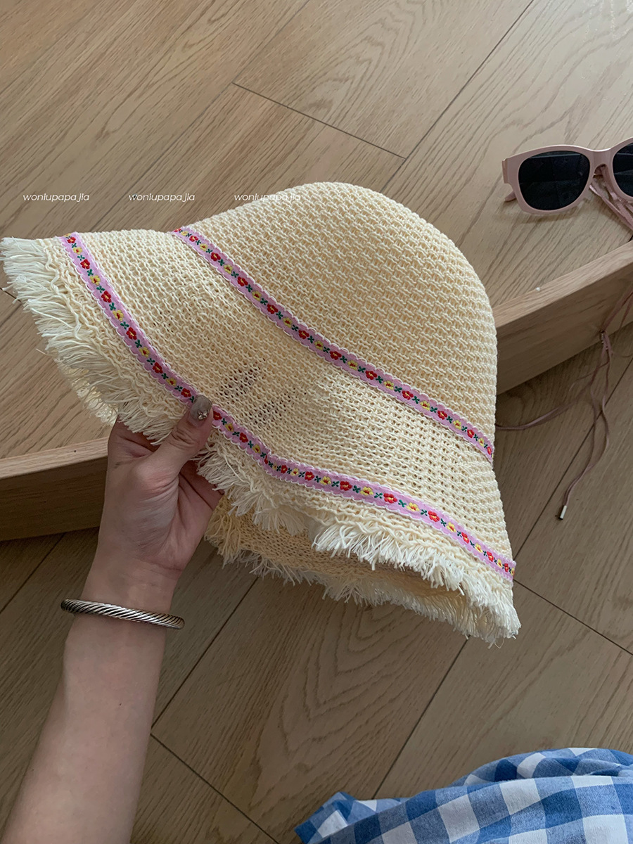 田园风花朵毛边大檐遮阳草帽夏季女海边沙滩度假镂空防晒太阳帽子