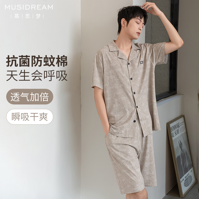 A类抗菌凉感棉开衫翻领短裤男士睡衣套装舒适透气纯棉家居服套装