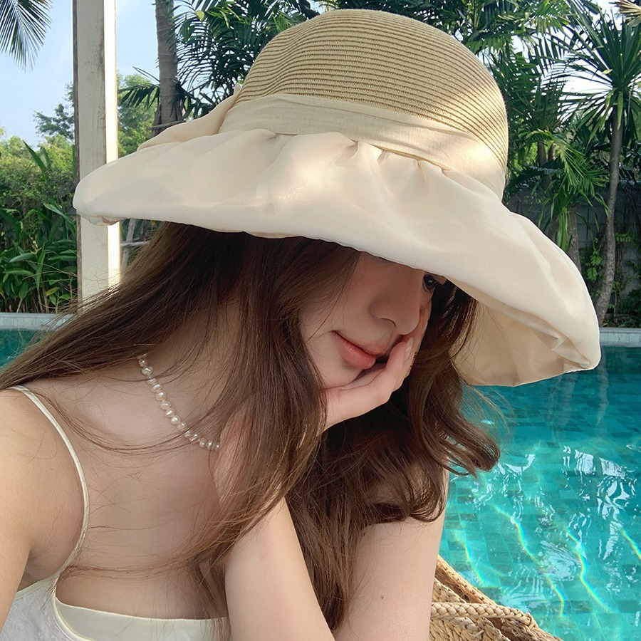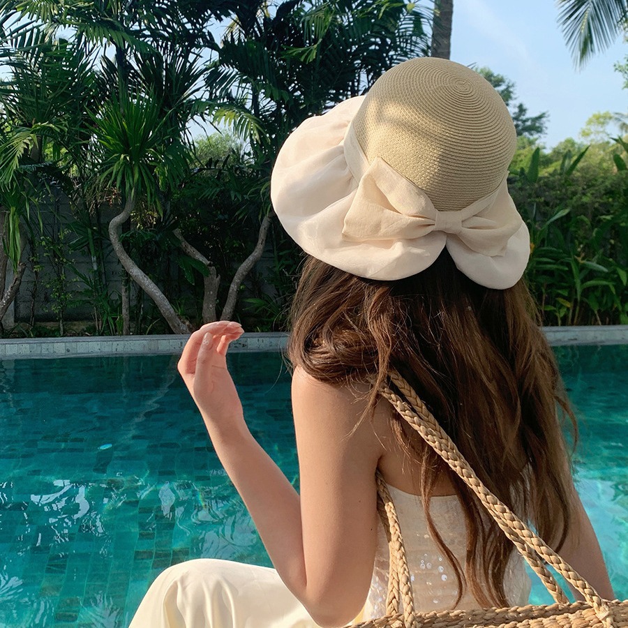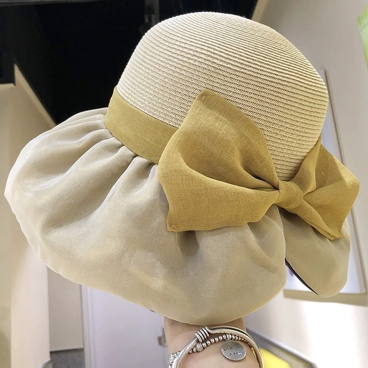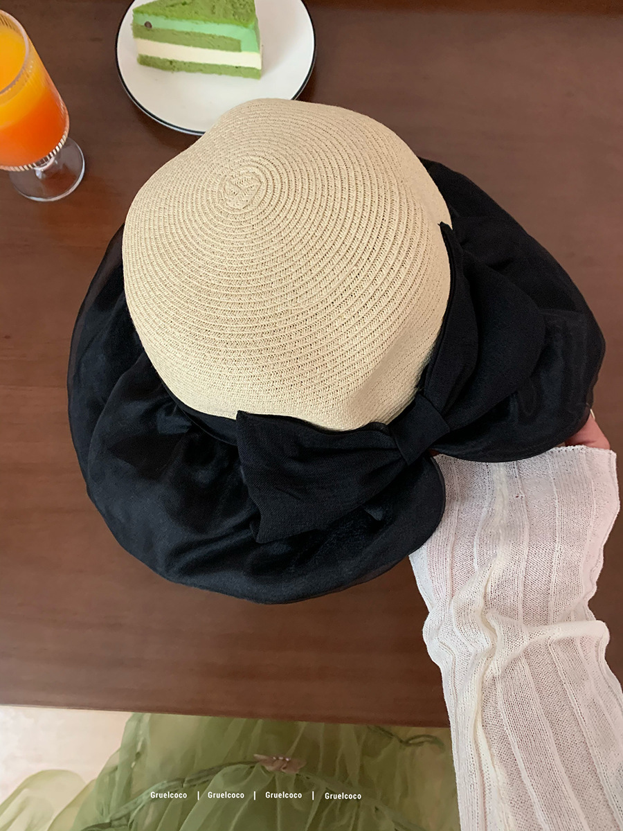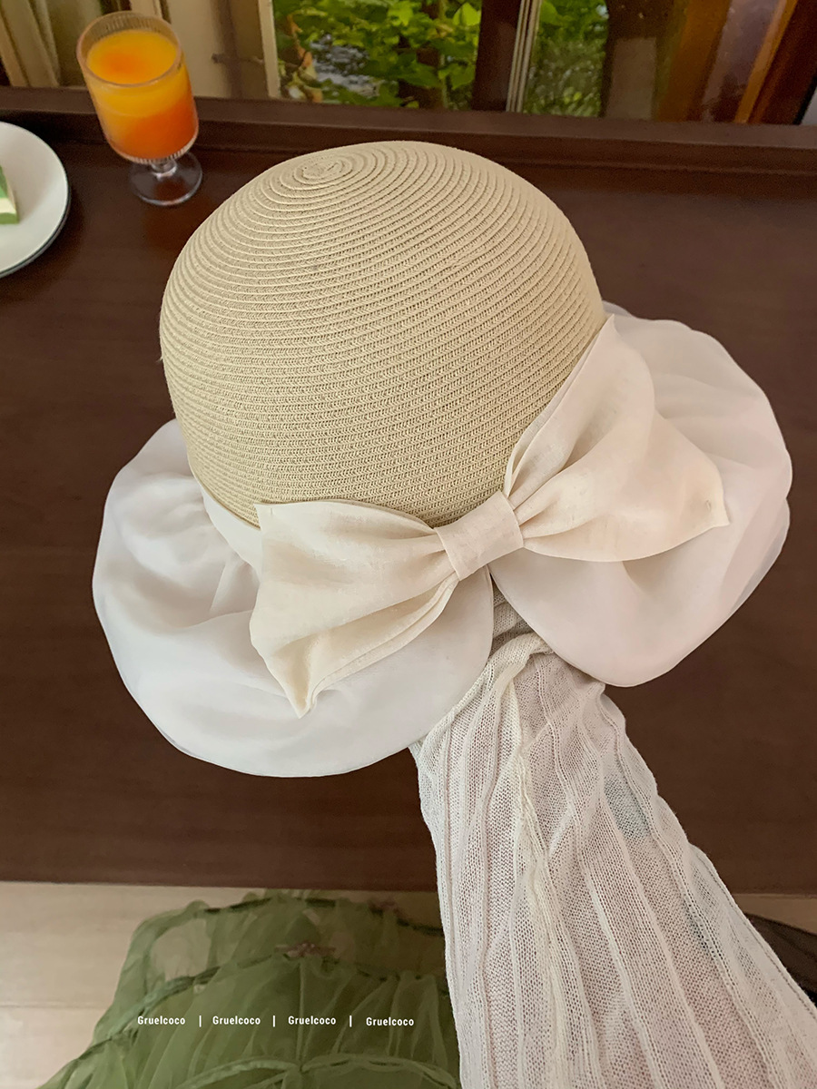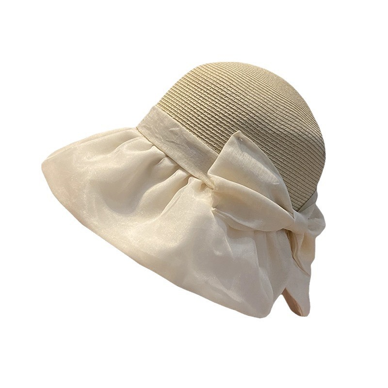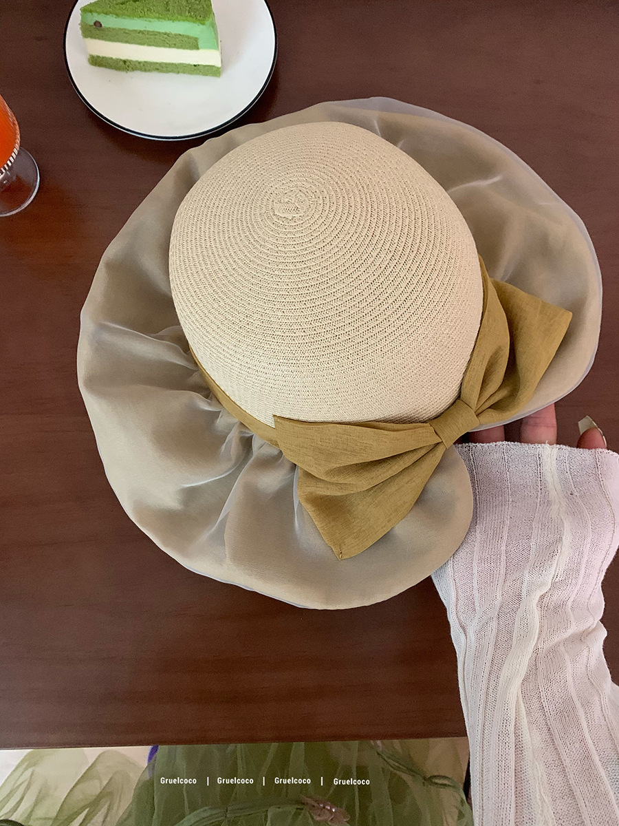 韩系遮阳草帽女欧根纱蝴蝶结草编帽夏海边度假网红拍照防晒渔夫帽