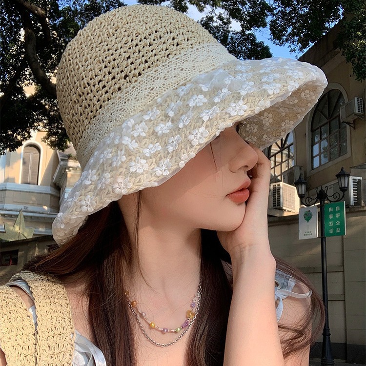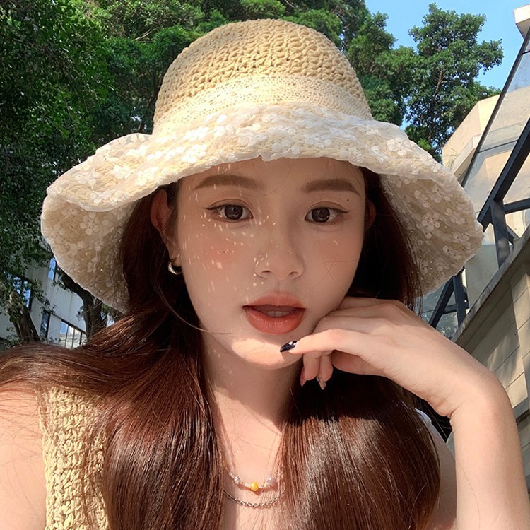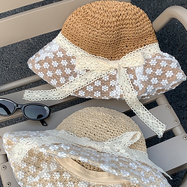 蕾丝草帽女新款日系小清新草编帽子夏季出游防晒帽大檐沙滩遮阳帽