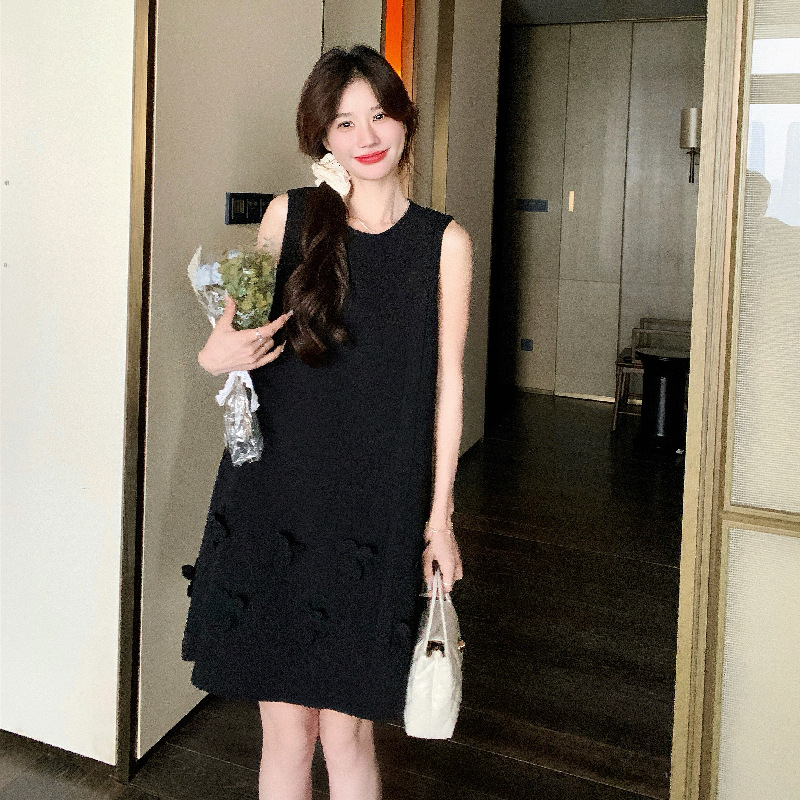 精致赫本风立体花瓣装饰无袖小黑裙经典蝴蝶结A字名媛休闲连衣裙