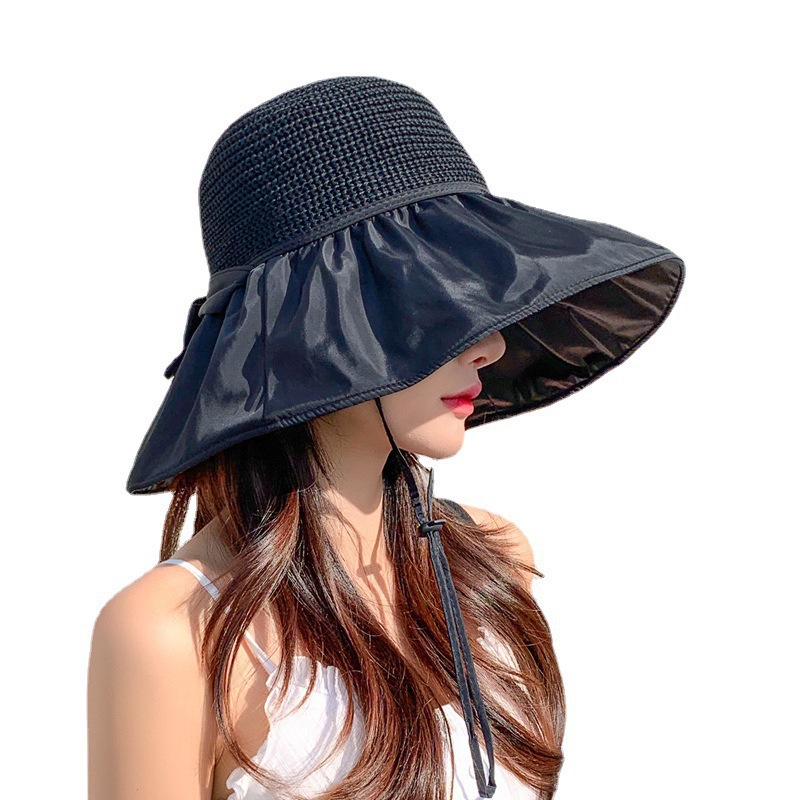 黑胶蝴蝶结镂空草帽遮阳帽女夏季防紫外线大檐遮脸防晒太阳渔夫帽