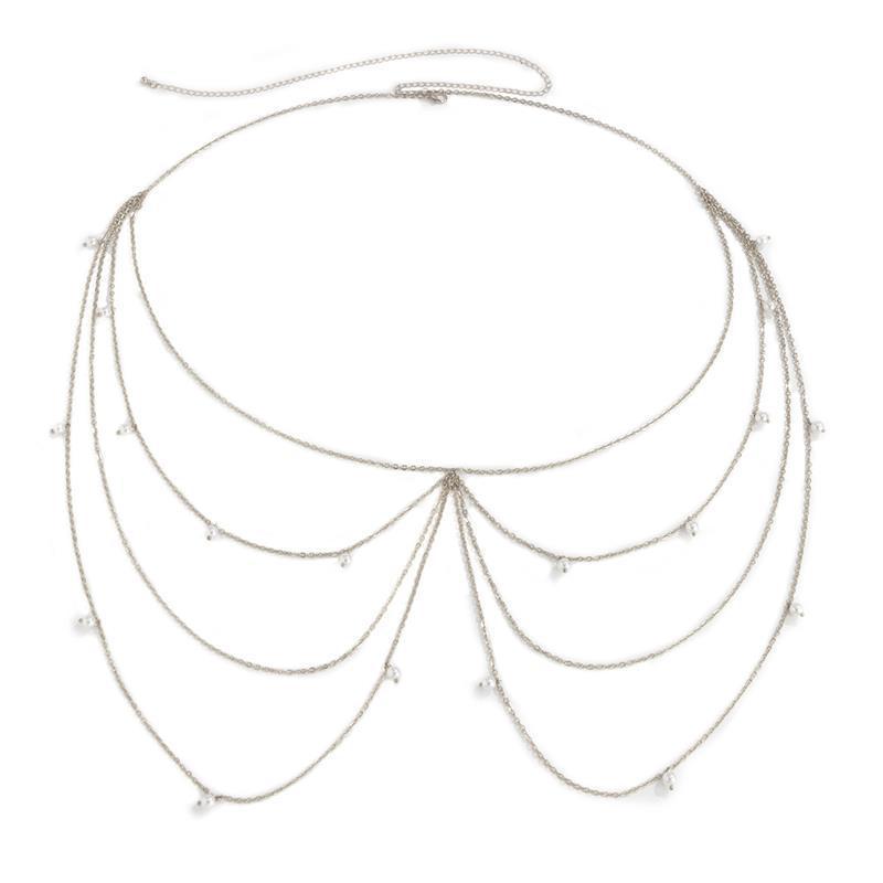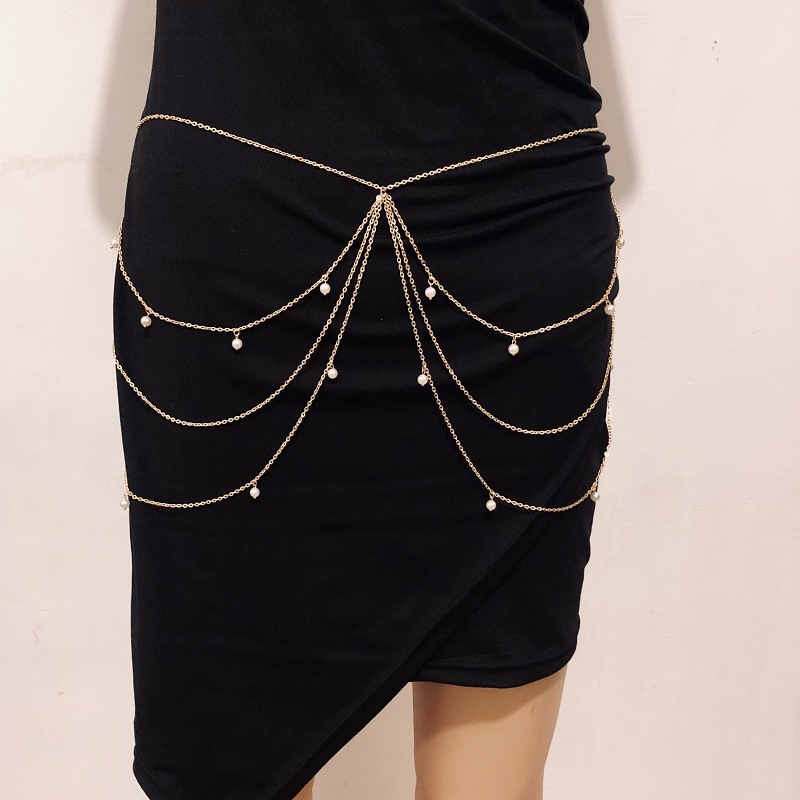欧美跨境饰品 简约仿珍珠流苏链条款身体链条腰链 多层金属身体链