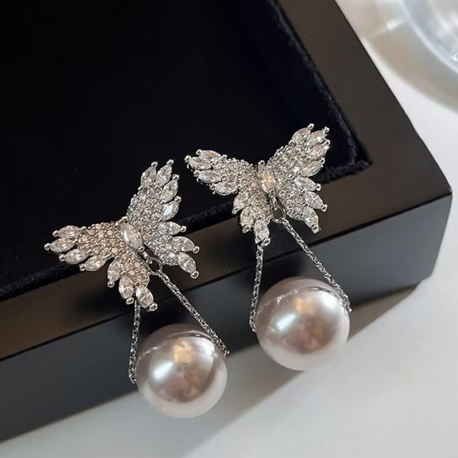 S925银针曼塔玫瑰紫珍珠锆石蝴蝶耳钉轻奢时尚优雅气质高级感耳饰