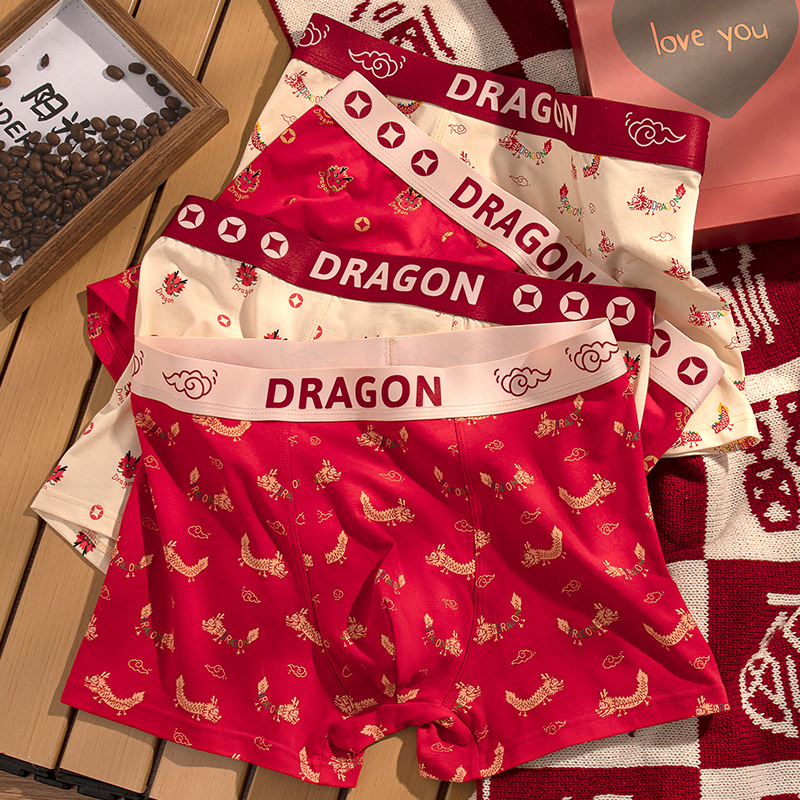 新款潮流印花男士内裤纯棉本命年大红平角裤男生内裤