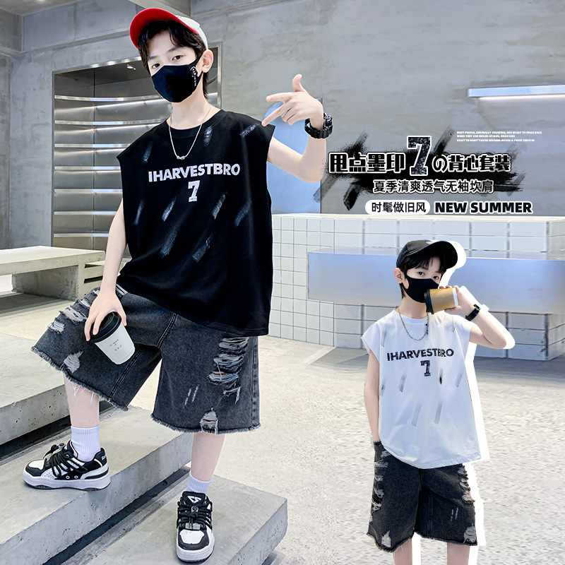 夏季新款大男童字母背心童装儿童男孩纯色无袖背心个性潮酷百搭