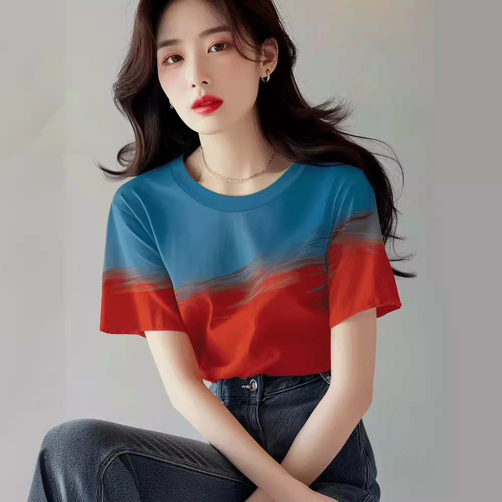 红色晕染短袖t恤女新款爆款夏季时尚洋气撞色体恤上衣高级感