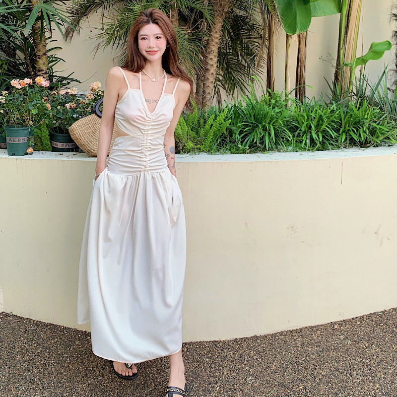 夏季新款修身大露背褶皱显瘦吊带休闲度假连衣裙长款女