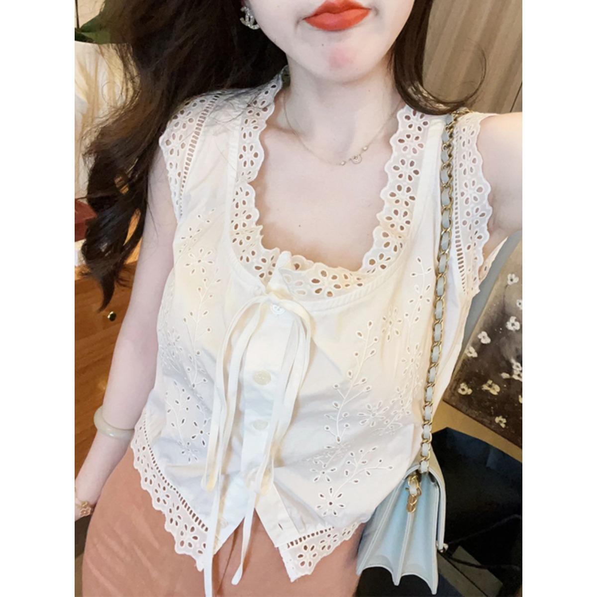 法式复古V领蕾丝花边衬衫女夏季设计感小众褶皱衬衣别致洋气小衫