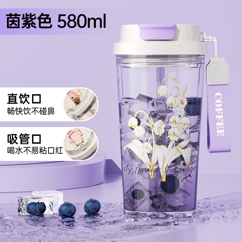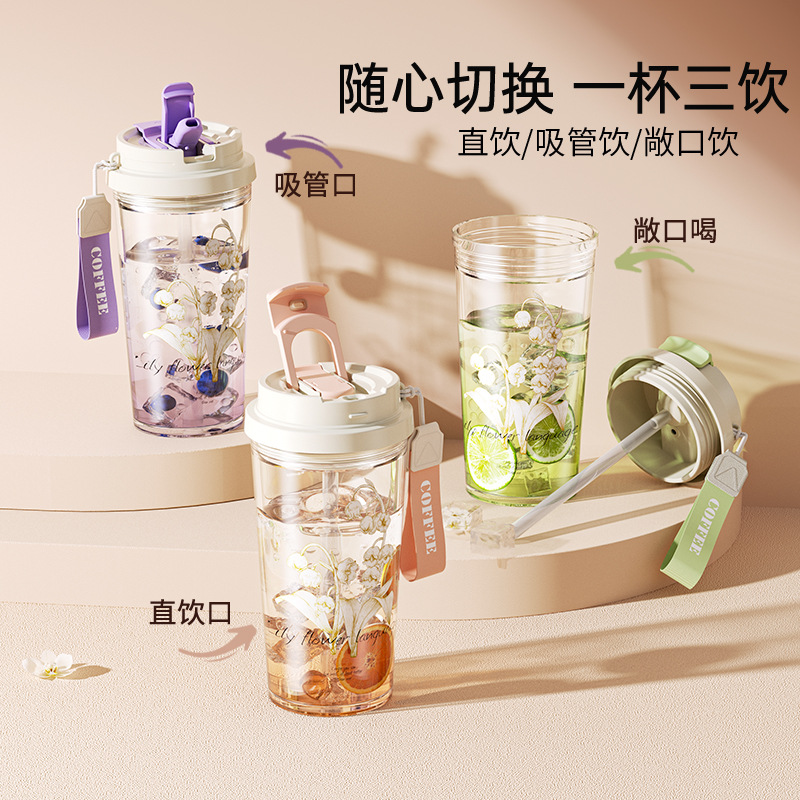新款铃兰花大容量双饮塑料杯高颜值男女便携吸管杯耐高温运动水杯