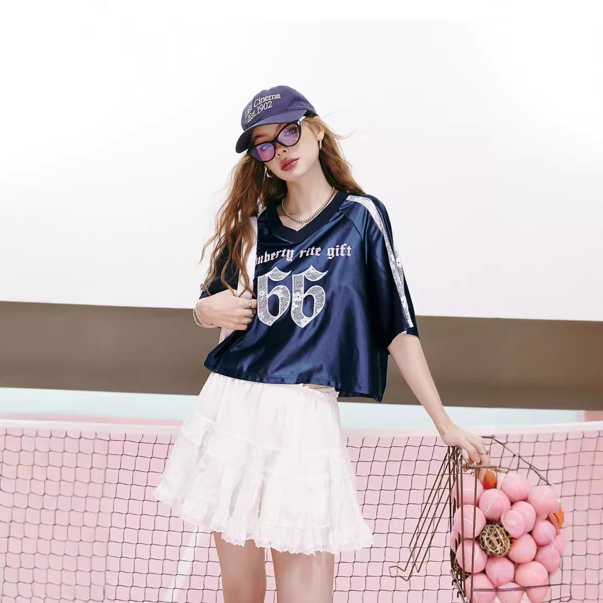 蕾丝拼接v领短袖t恤女学院风宽松显瘦上衣