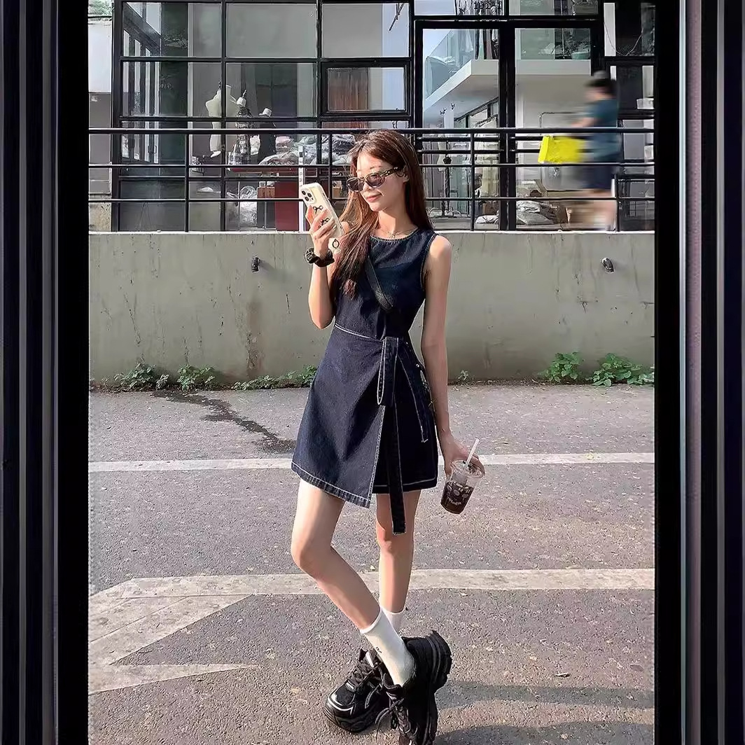 法式复古牛仔连衣裙女夏季设计感系带不规则背心裙小个子A字短裙