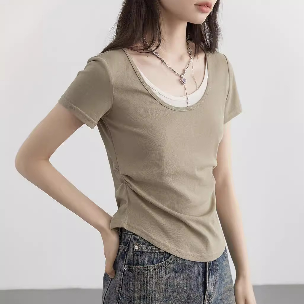 「遇见夏日」夏季新款U领撞色假两件褶皱T恤正肩短袖上衣