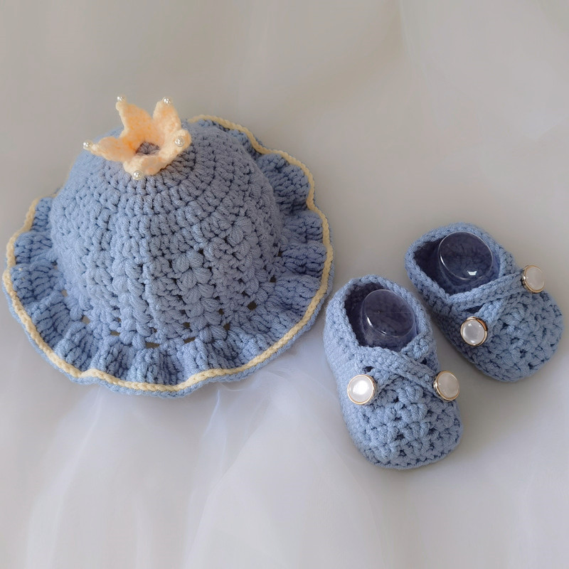 烟灰蓝鞋帽套装婴儿孕妈毛线鞋钩针新手满月周岁材料