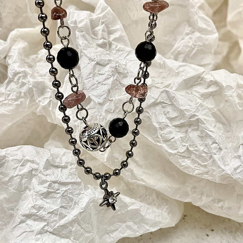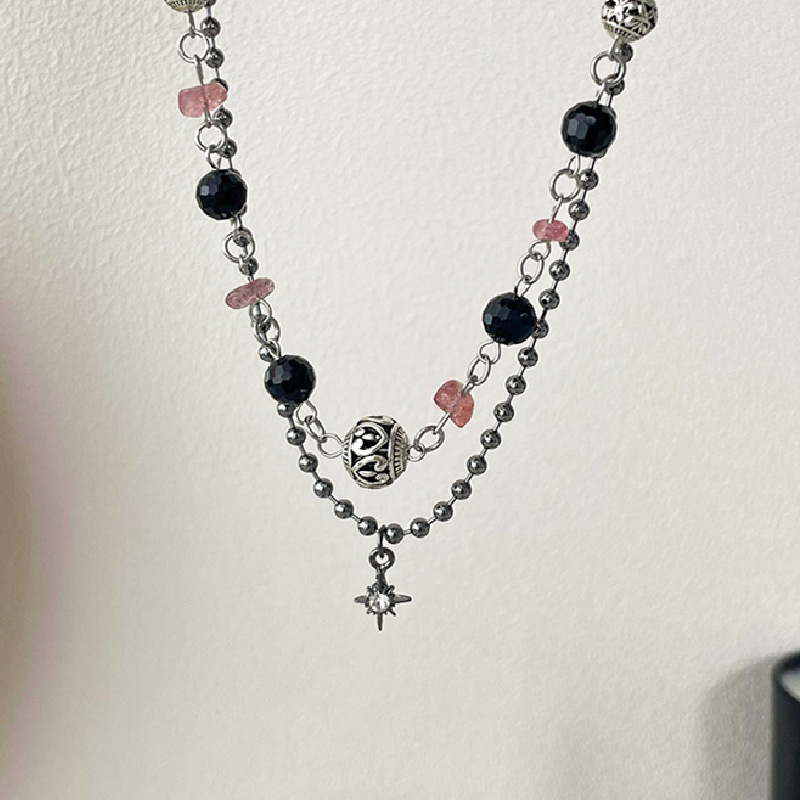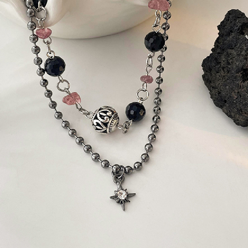 钛钢复古个性辣妹暗黑风双层叠戴项链小众石头串珠黑粉色锁骨链女