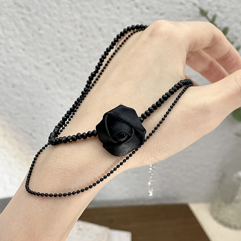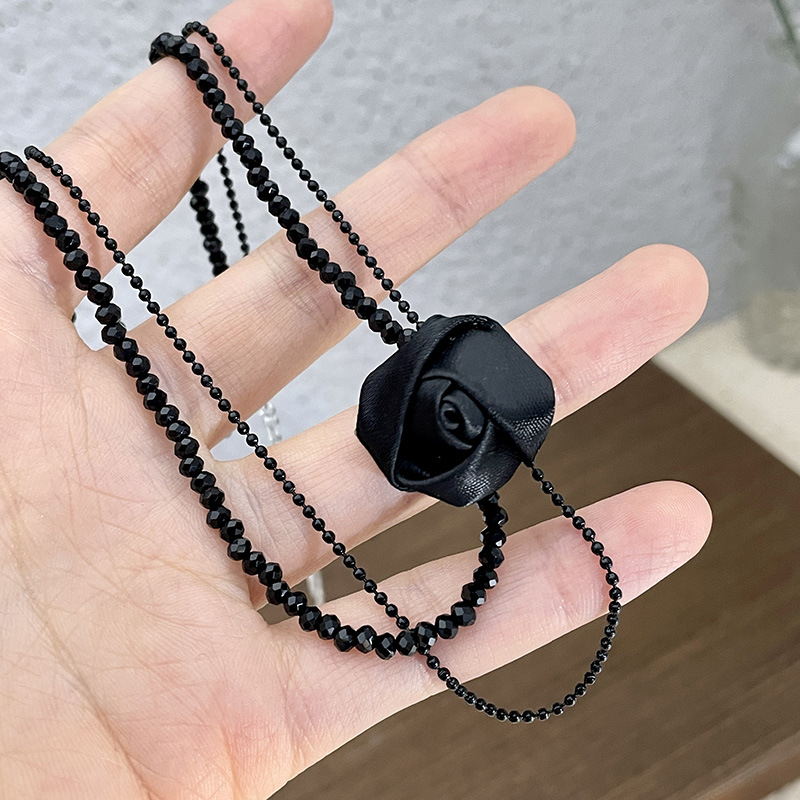 新款黑色水晶串珠双层项链黑玫瑰叠戴颈链短款颈带项圈锁骨链