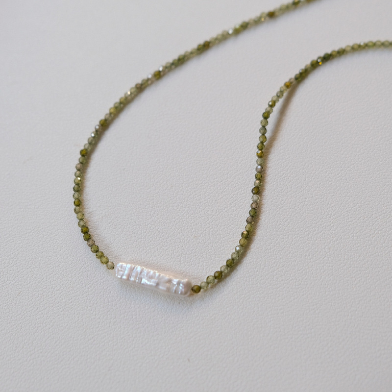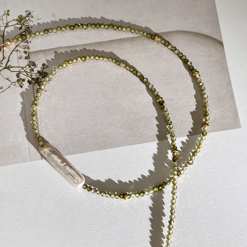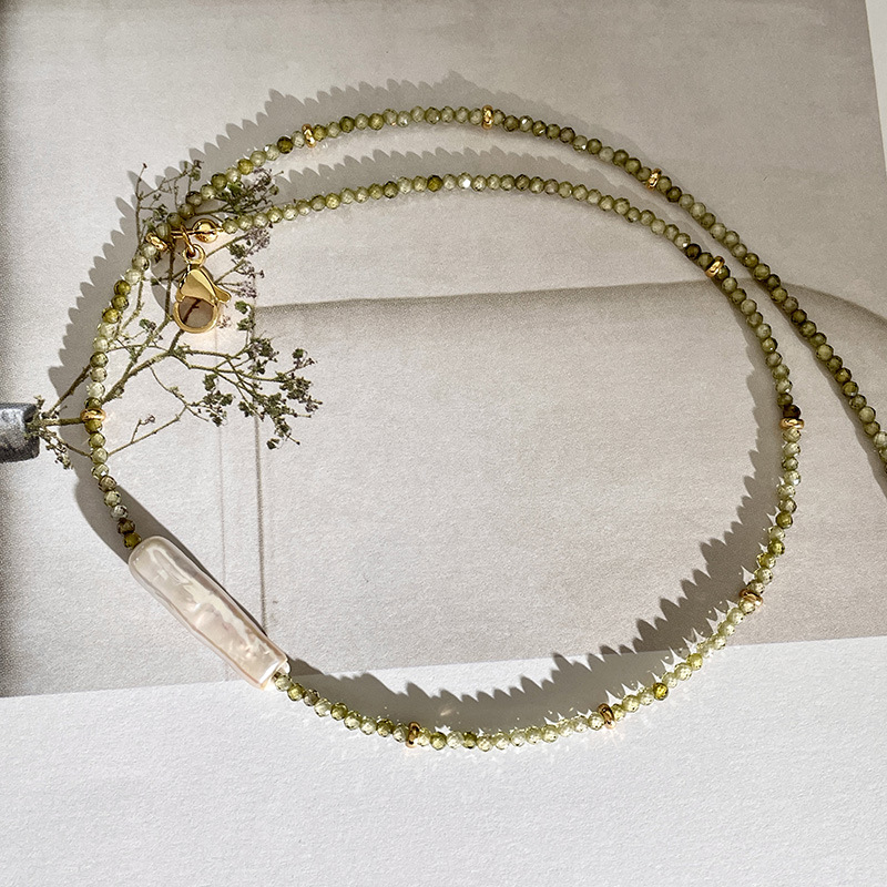 橄榄绿圆形切面天然石颈链巴洛克淡水珍珠长条形串珠项链女锁骨链