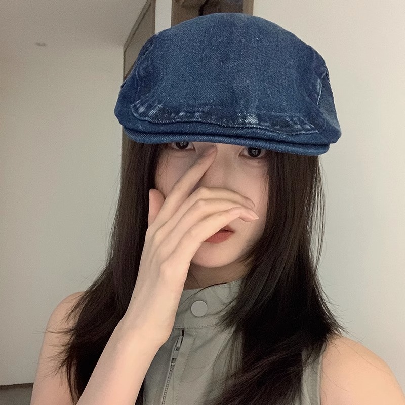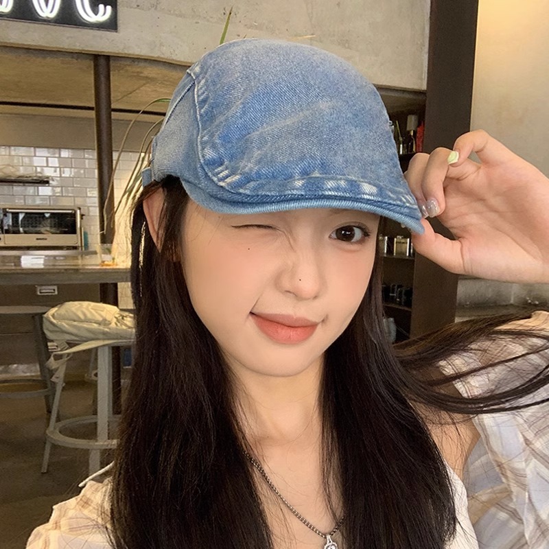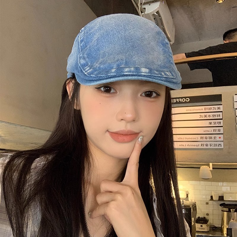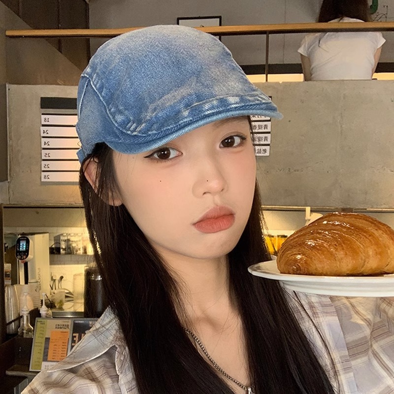 复古水洗做旧牛仔反戴贝雷帽女夏季港风英伦街头潮流前进帽鸭嘴帽