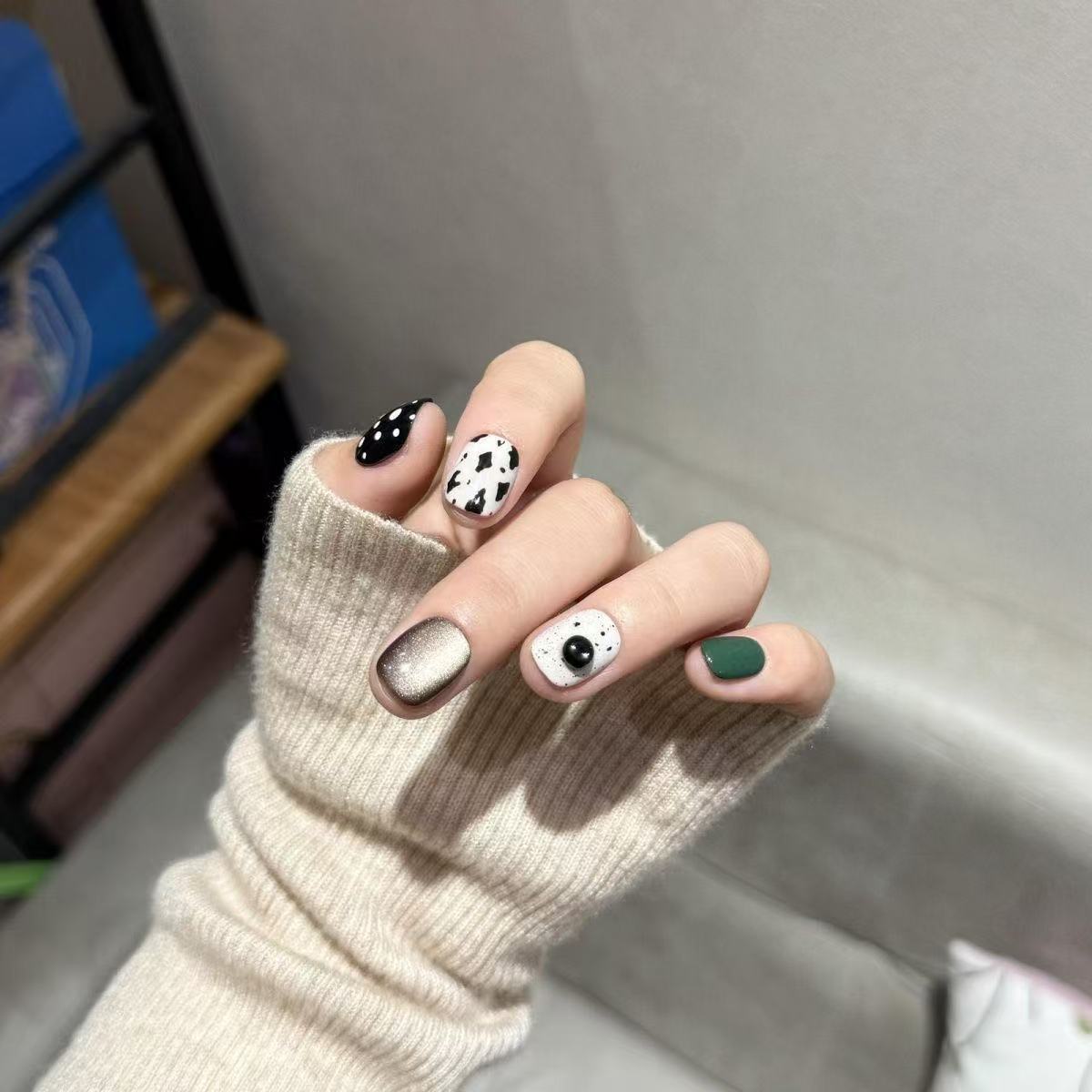 手工穿戴甲甜酷辣妹手绘波点猫眼甲片立体纹理拼色涂鸦高级感美甲