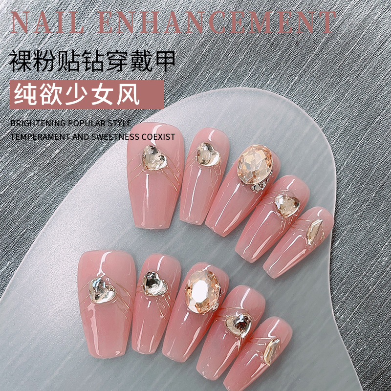 纯手工穿戴甲裸粉心形K9钻美甲可拆卸重复使用光疗甲片显白假指甲
