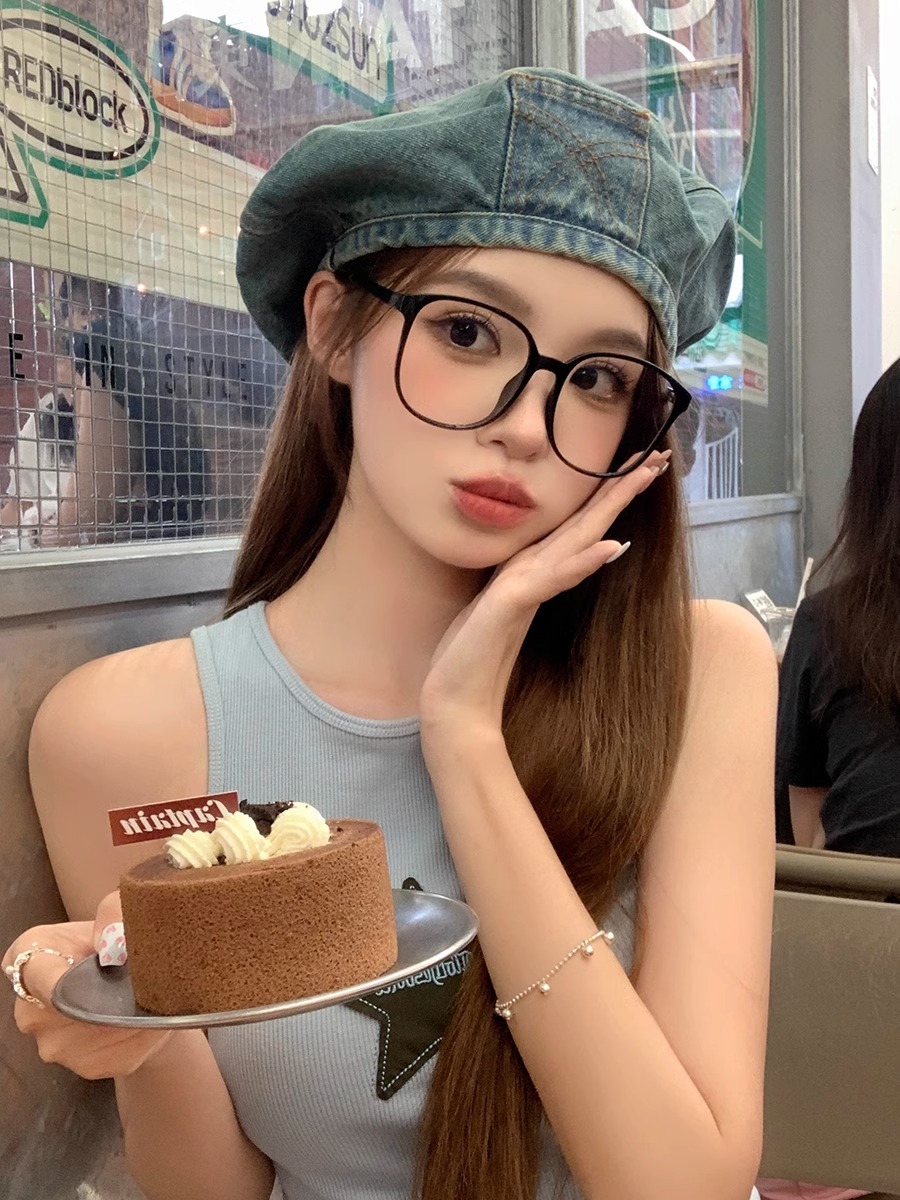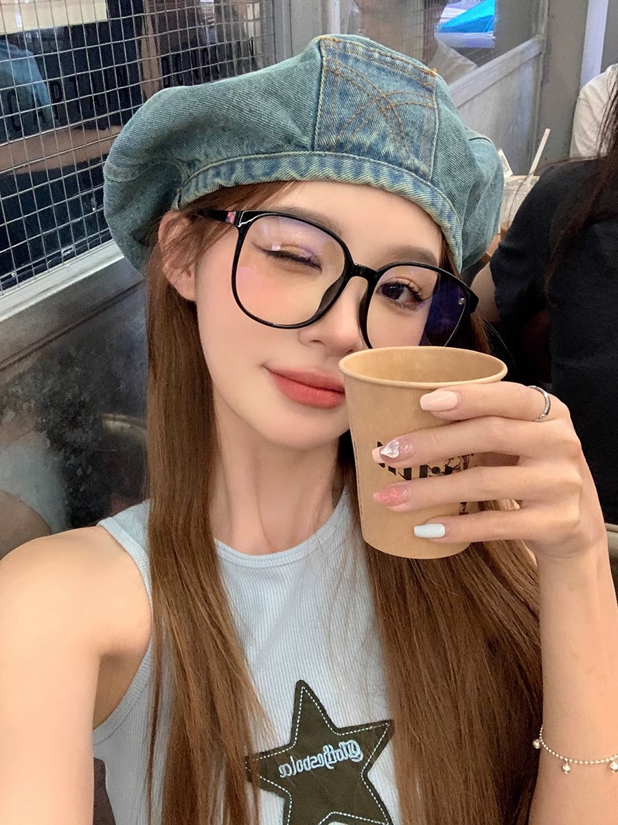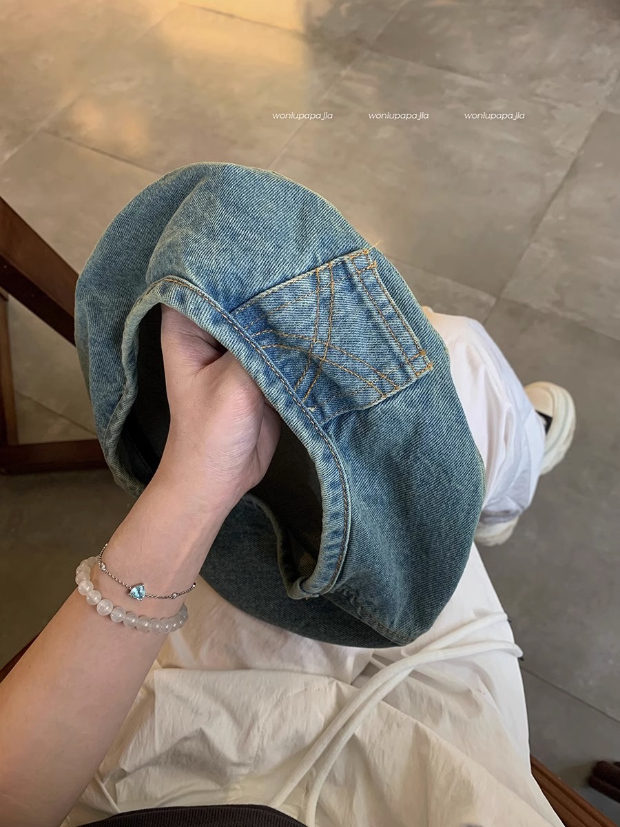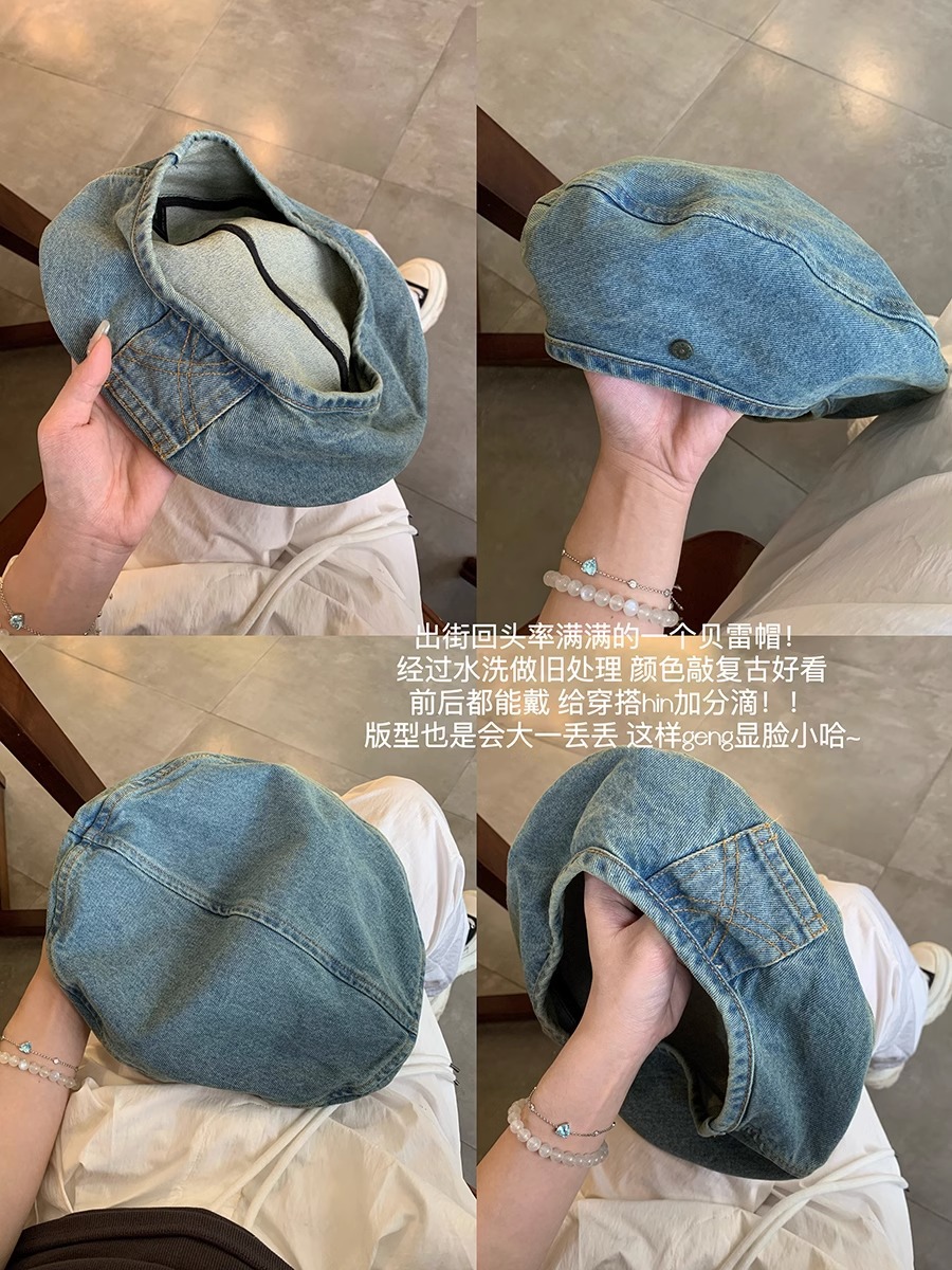 蓝色牛仔贝雷帽女大头围云朵帽显脸小复古蓓蕾画家帽