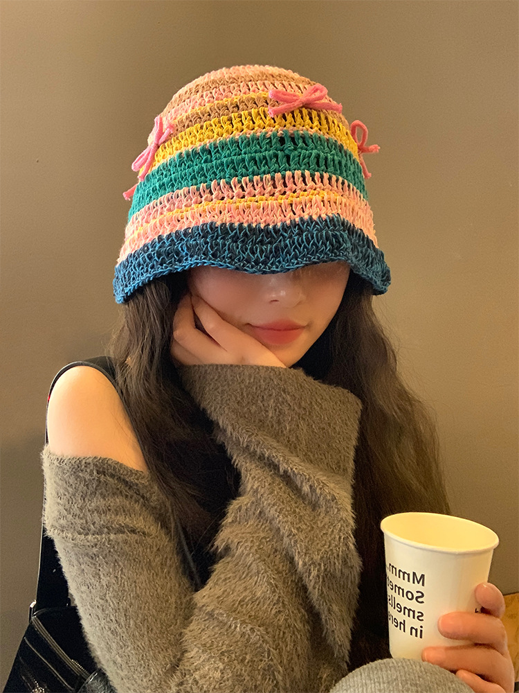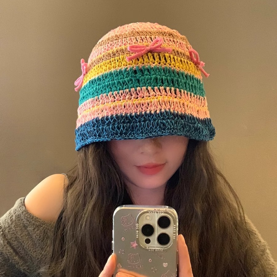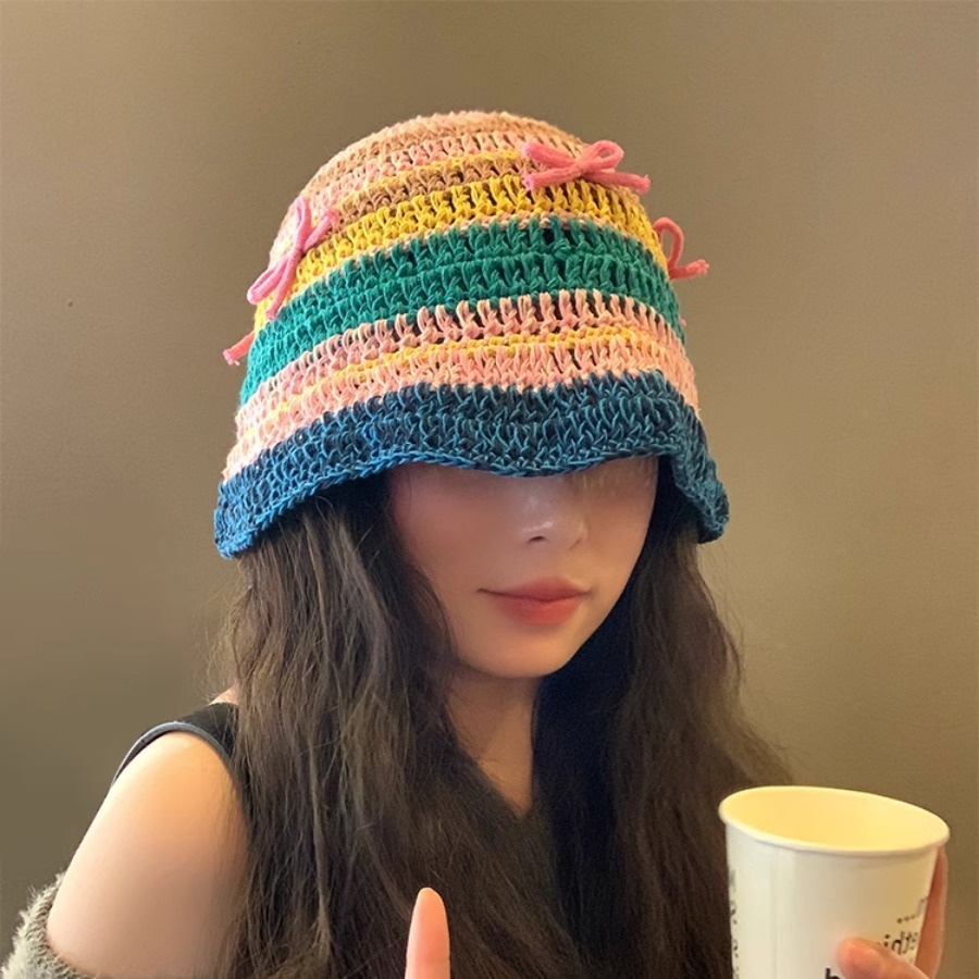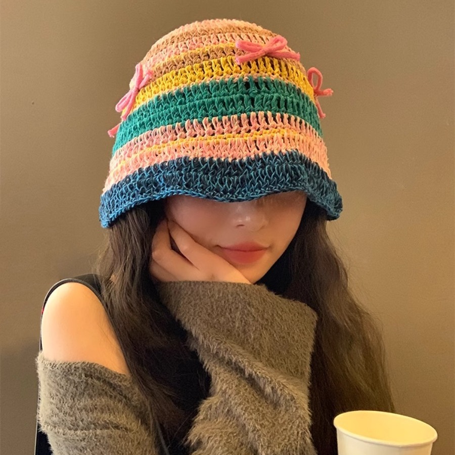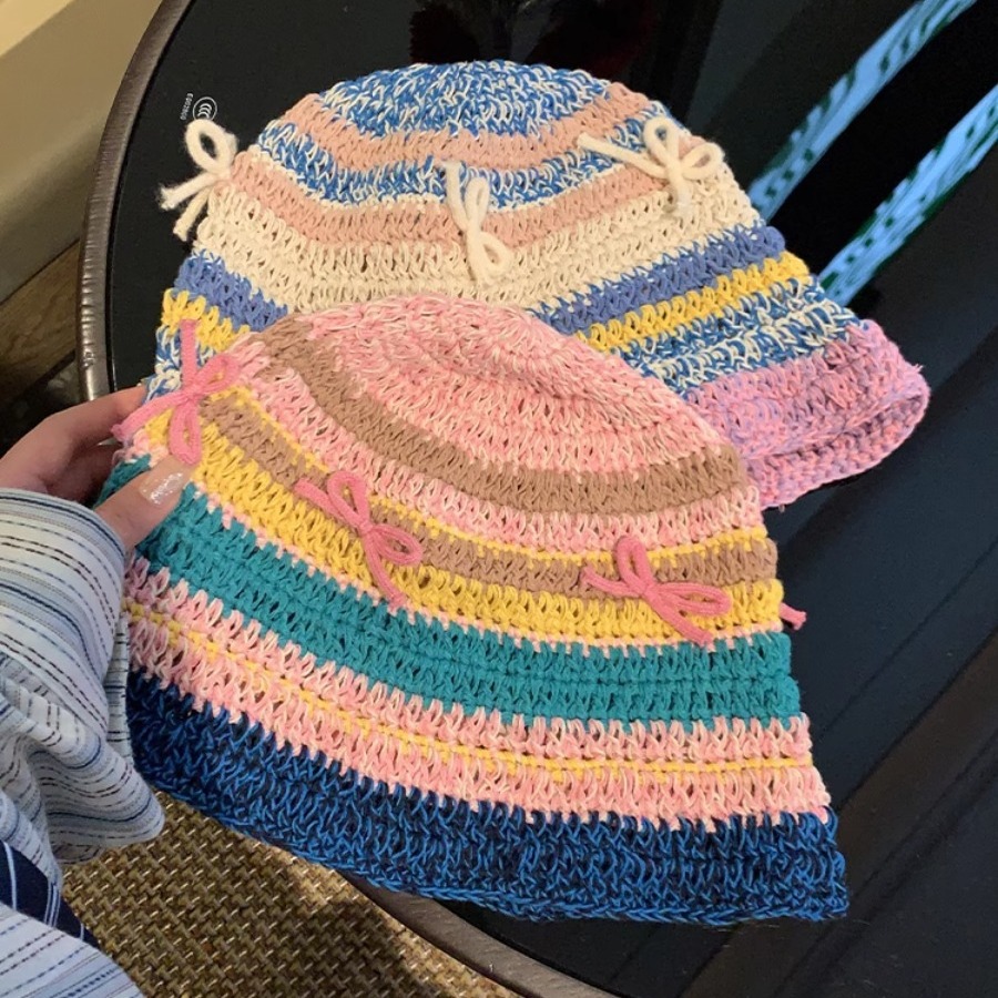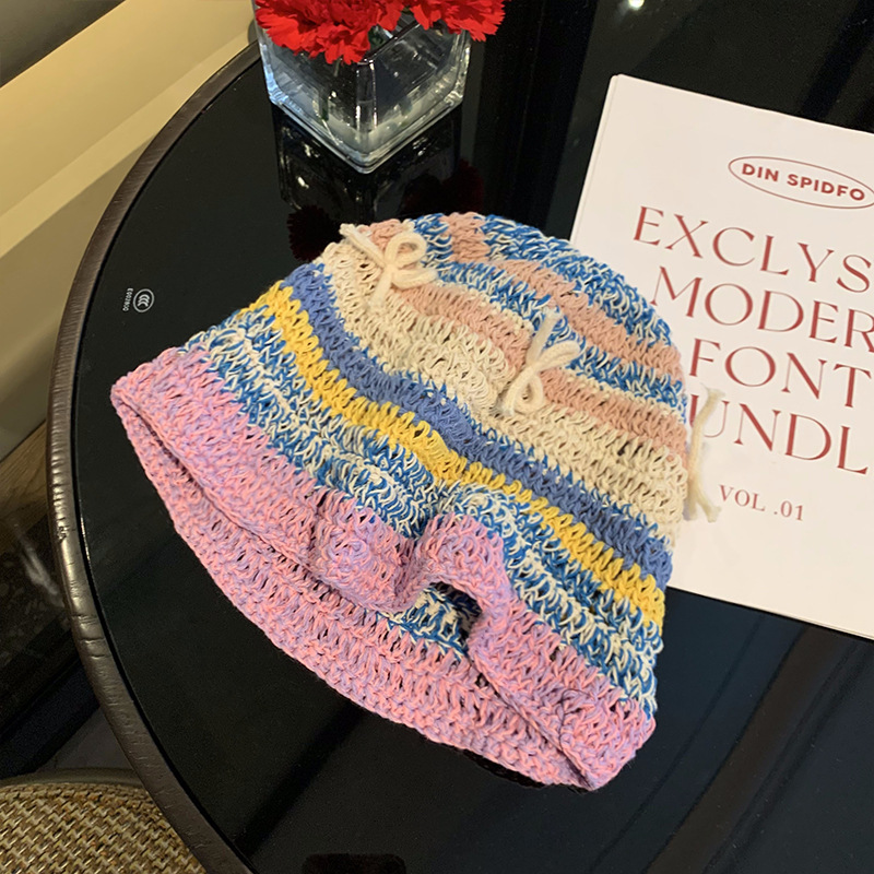 彩色编织蝴蝶结渔夫帽女夏新款韩版显脸小出游防晒遮阳水桶帽