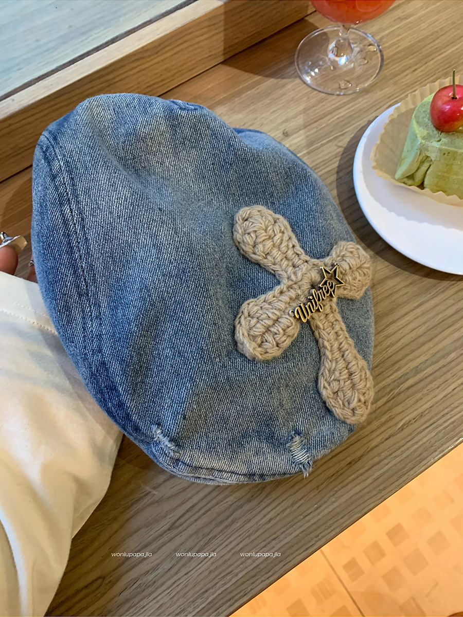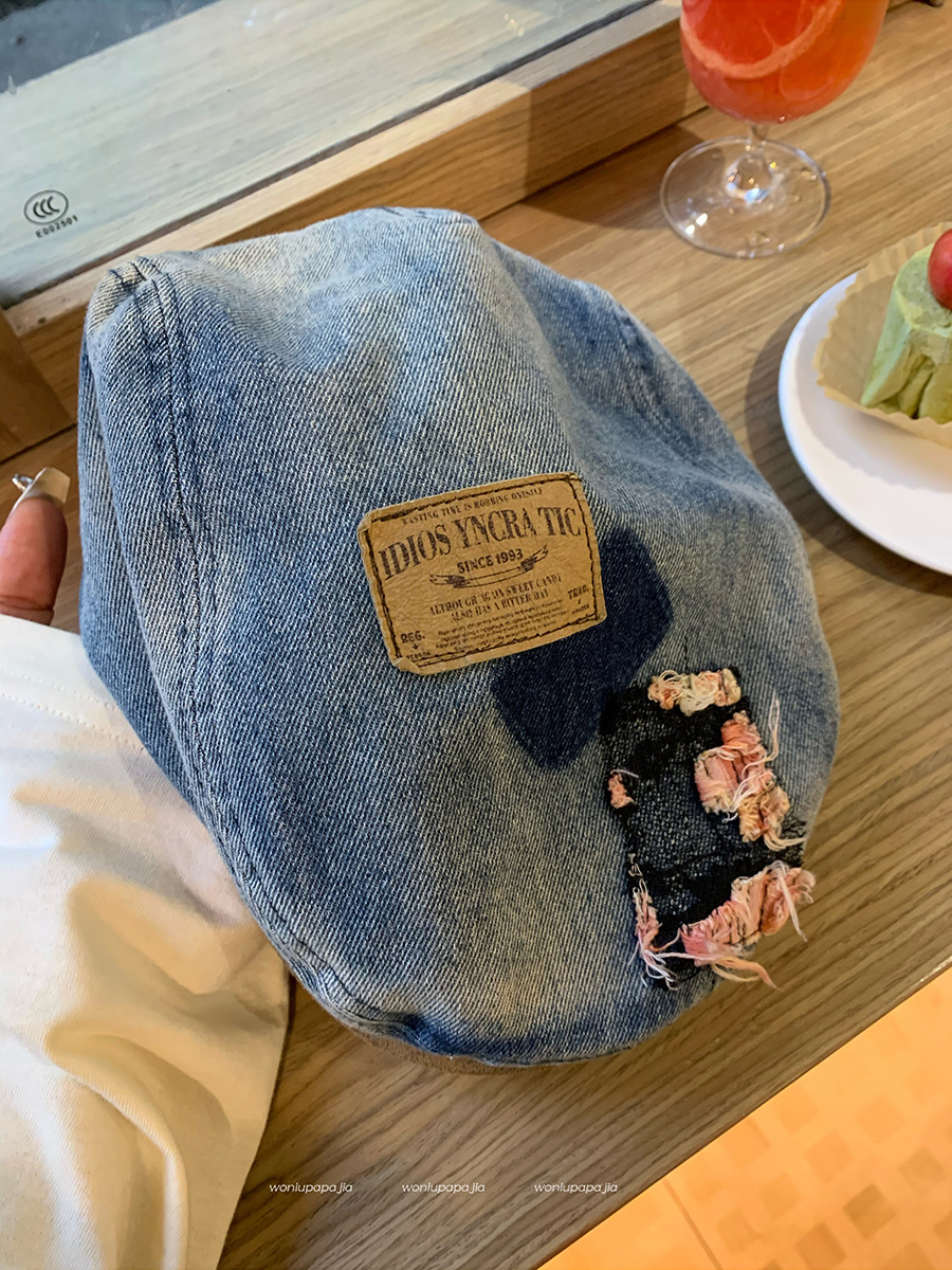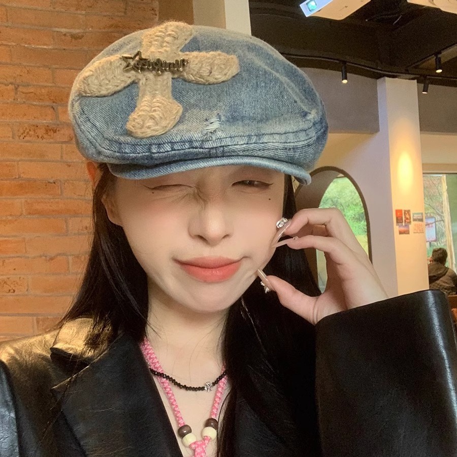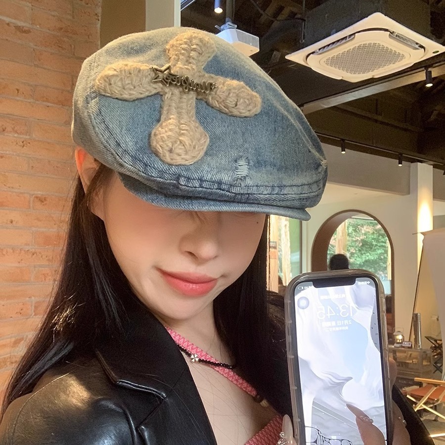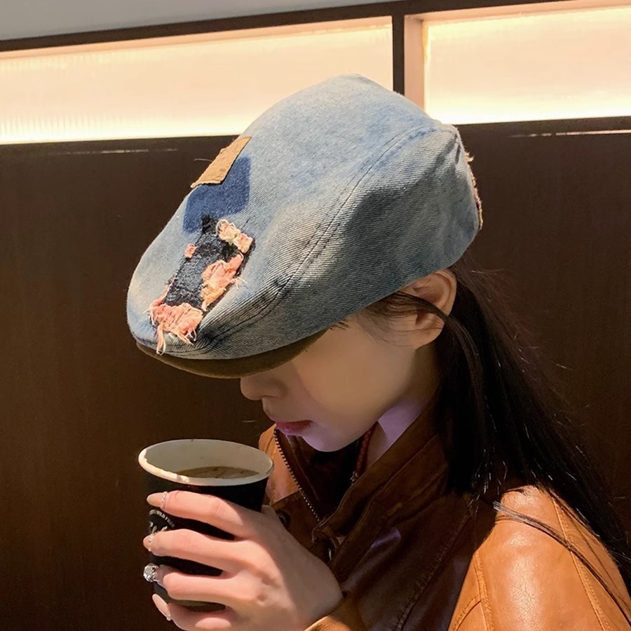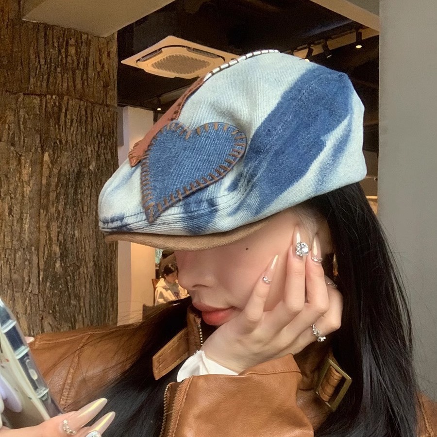 小众牛仔前进帽女春季小帽檐金属标爱心贴布鸭嘴帽时尚显瘦贝雷帽