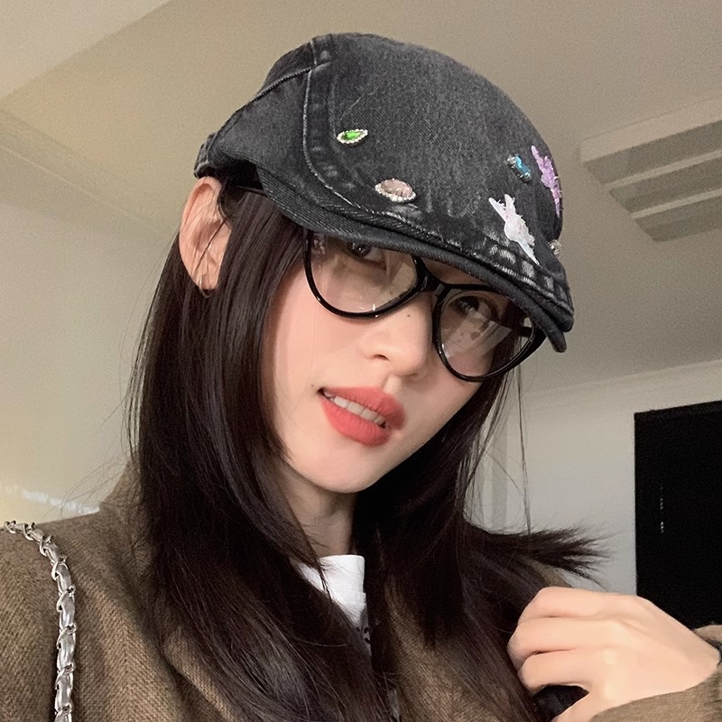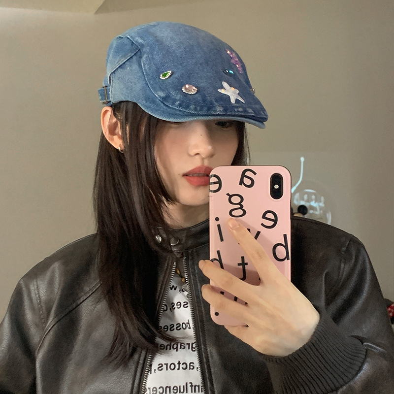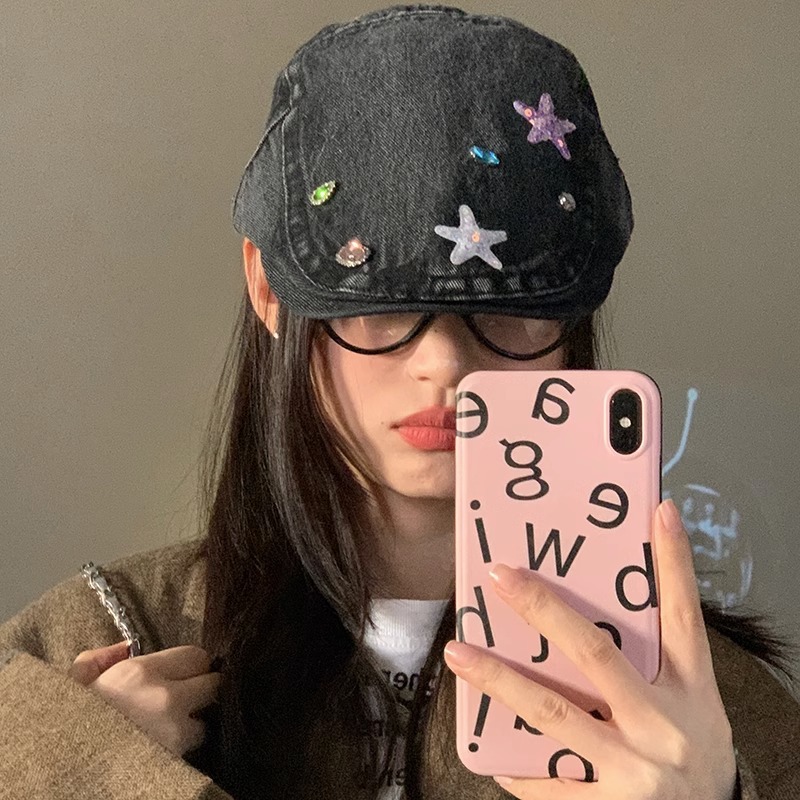 日系复古星星牛仔前进帽女大头围英伦风画家帽韩版休闲百搭鸭舌帽
