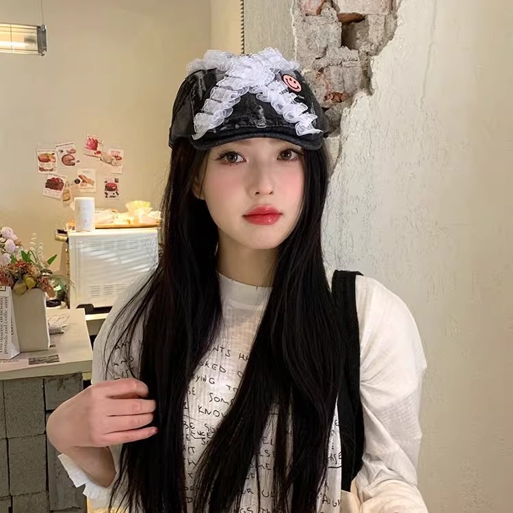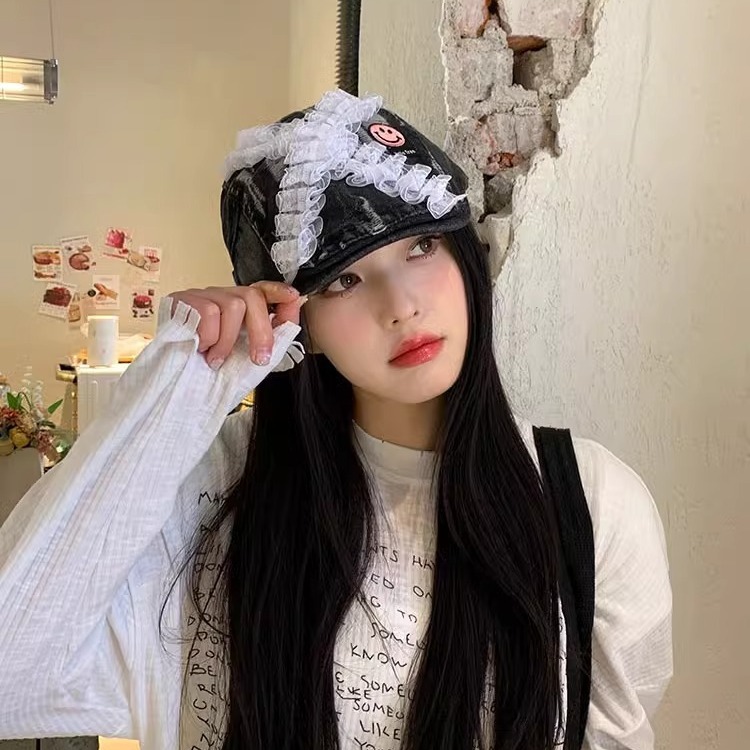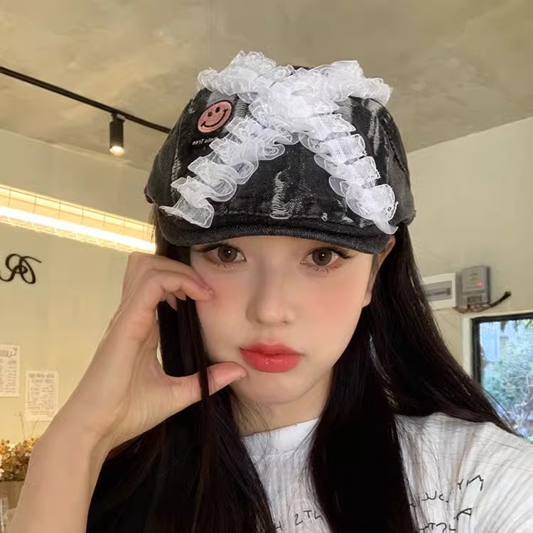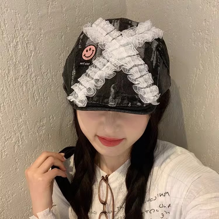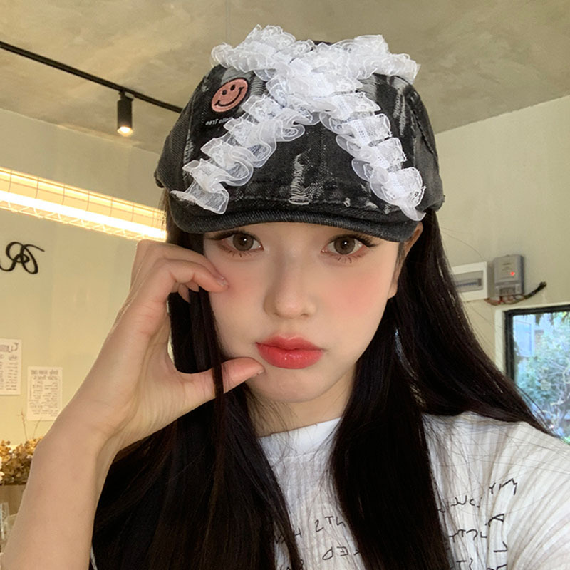 鸭舌帽子新款报童帽蕾丝做旧水洗牛仔前进帽子日系百搭鸭嘴帽