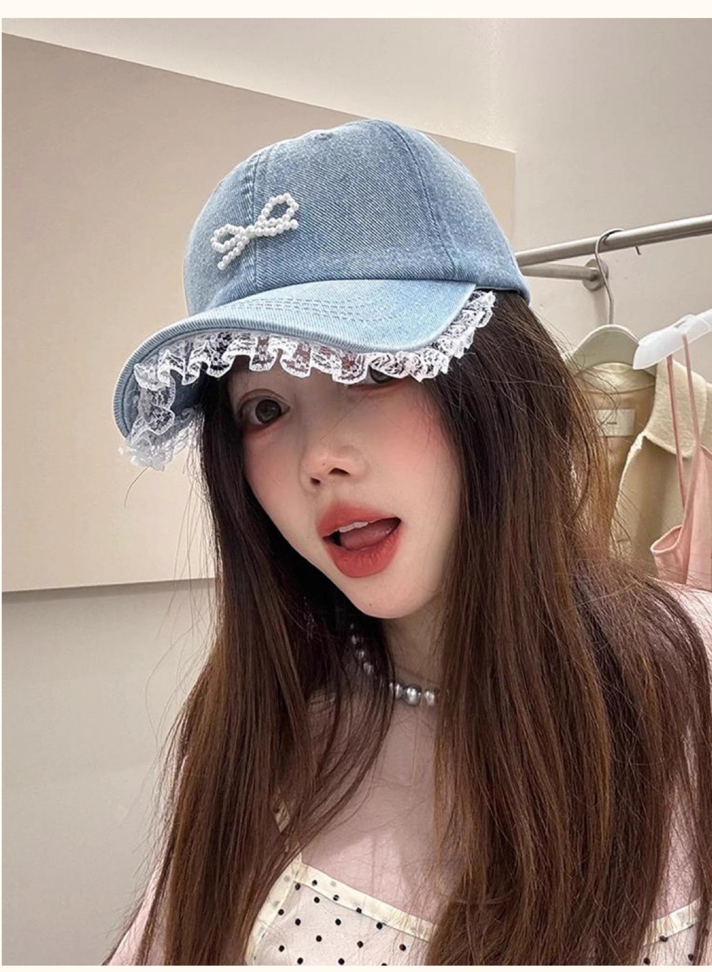 韩国新款蕾丝花边牛仔棒球帽子女春夏时尚百搭鸭舌帽显脸小牛仔帽