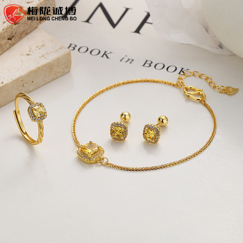 925纯银方糖首饰套装女方形黄锆ins风耳骨钉个性气质戒指满钻手链
