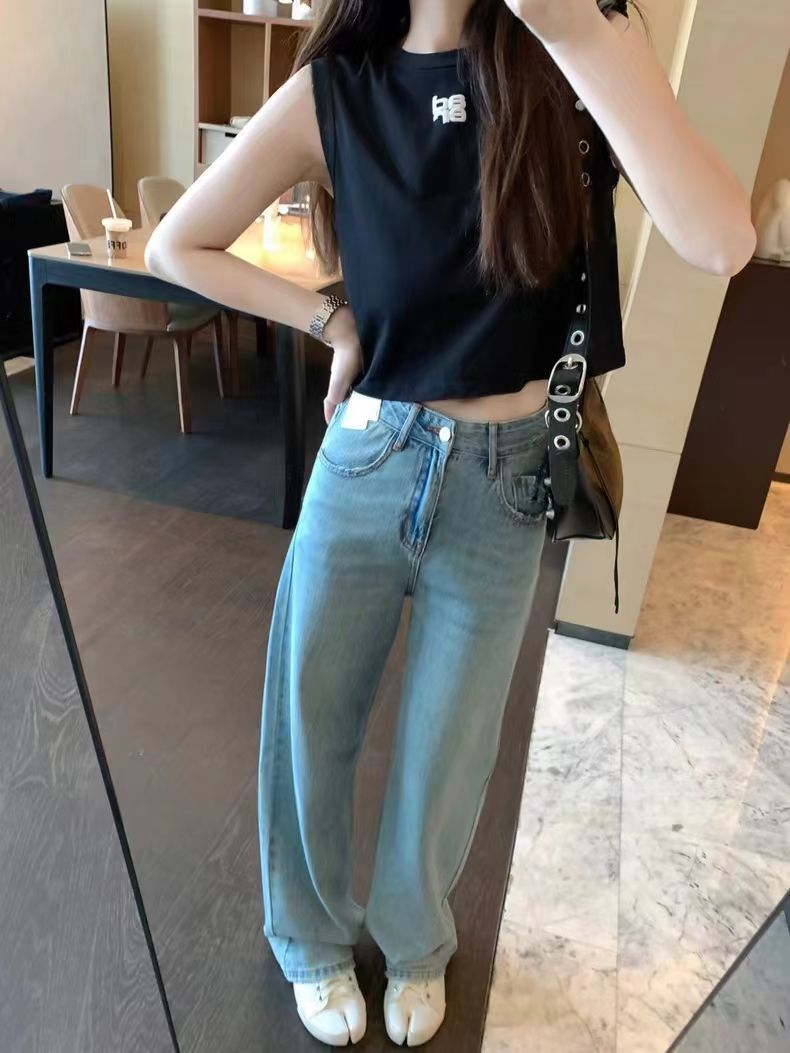 好质量学生宽松牛仔裤女九分裤高腰显瘦bf风阔腿裤直筒哈伦裤