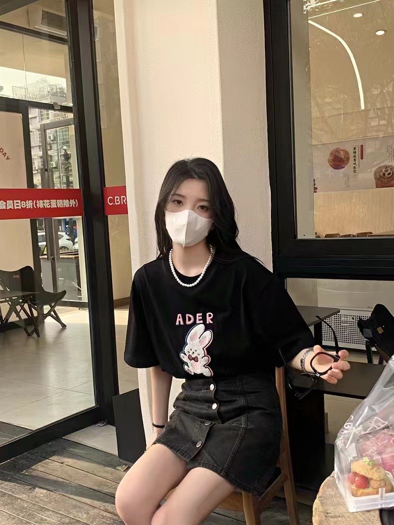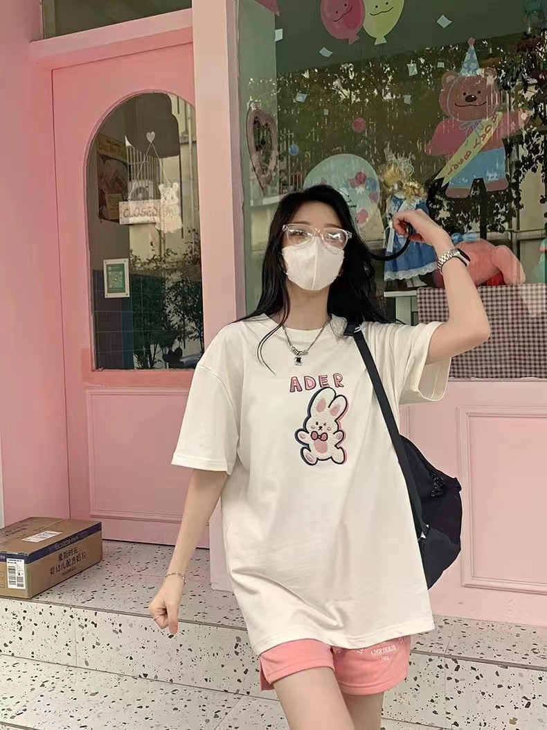 超手感莫代尔韩版小兔甜美宽松百搭圆领印花遮肉短袖t恤女ins打底