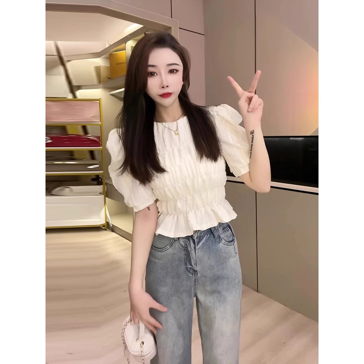 韩系chic小众设计高级感黑色皱褶衬衫上衣女夏别致独特泡泡袖小衫