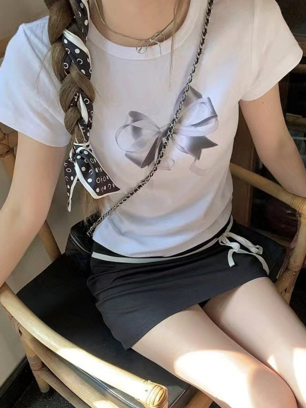 小众蝴蝶结圆领正肩短袖T恤女夏季小个子短款修身显瘦上衣潮牌t恤