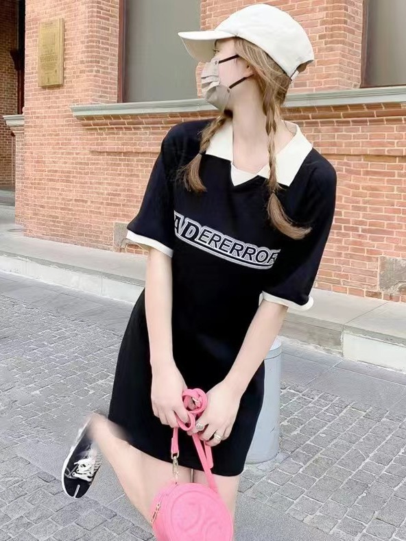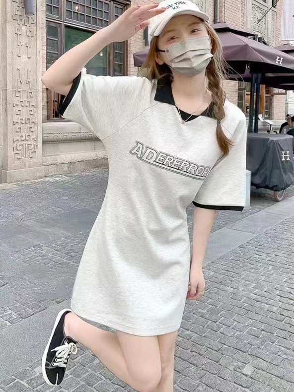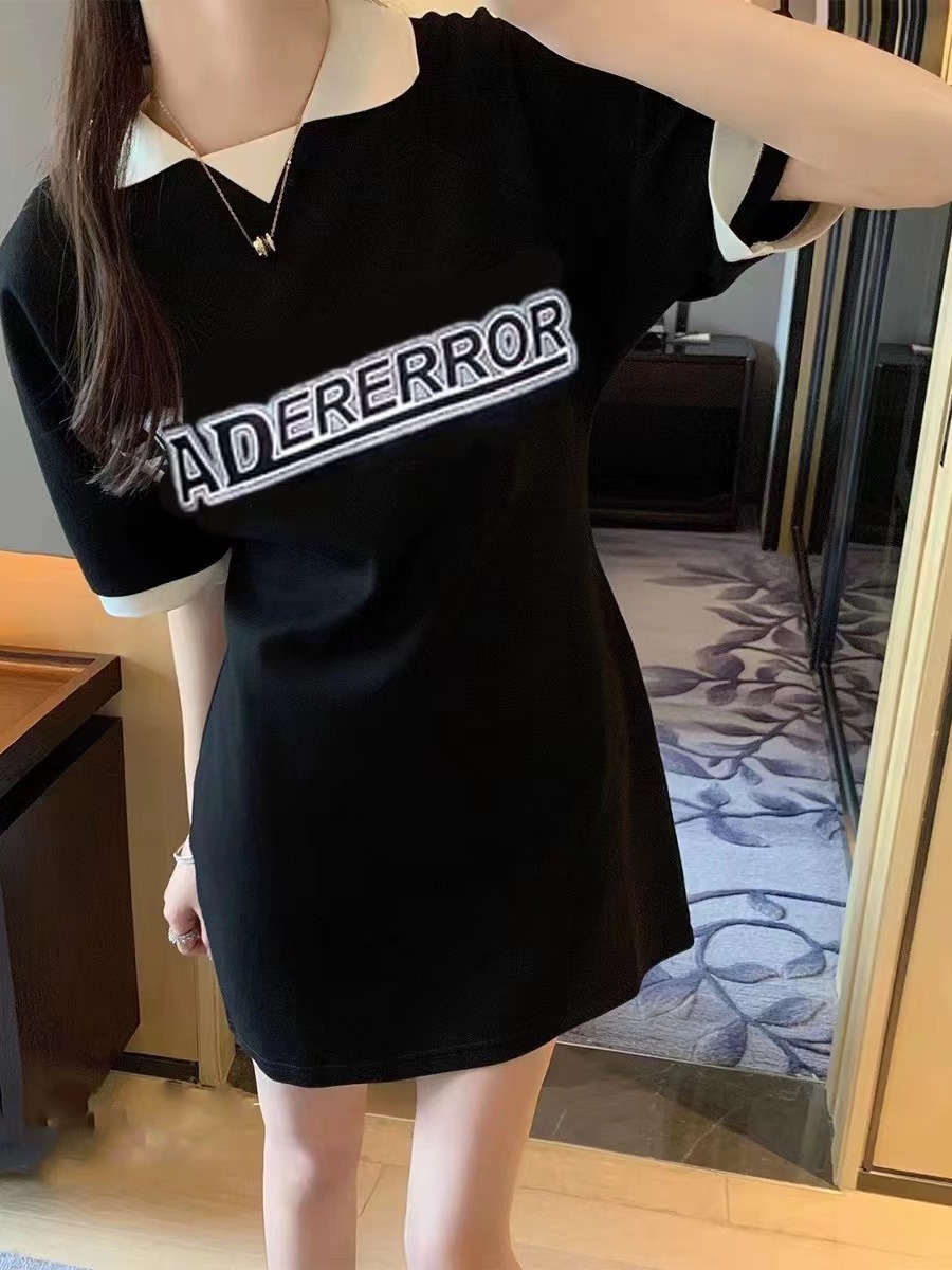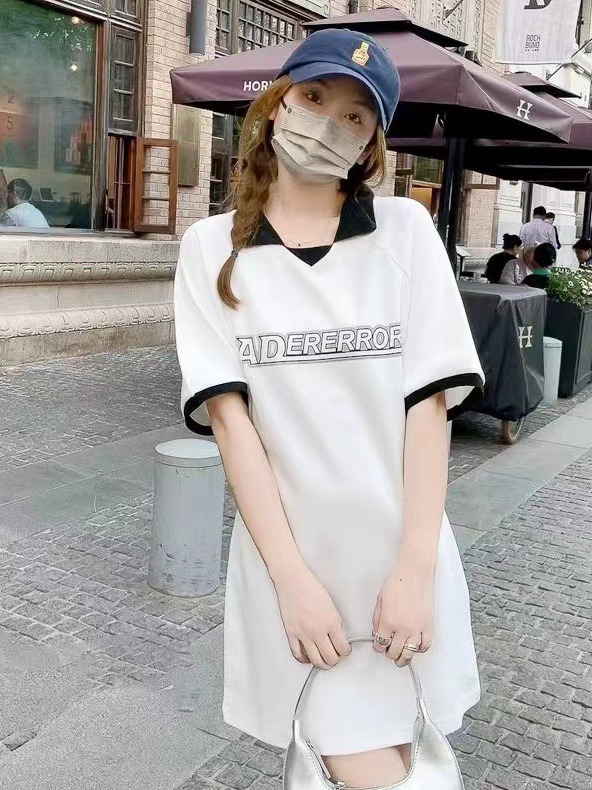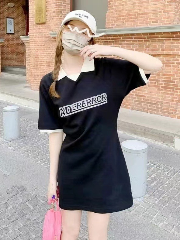 ader夏季女中长款POLO领连衣裙字母印花休闲上衣修身长T韩版潮牌