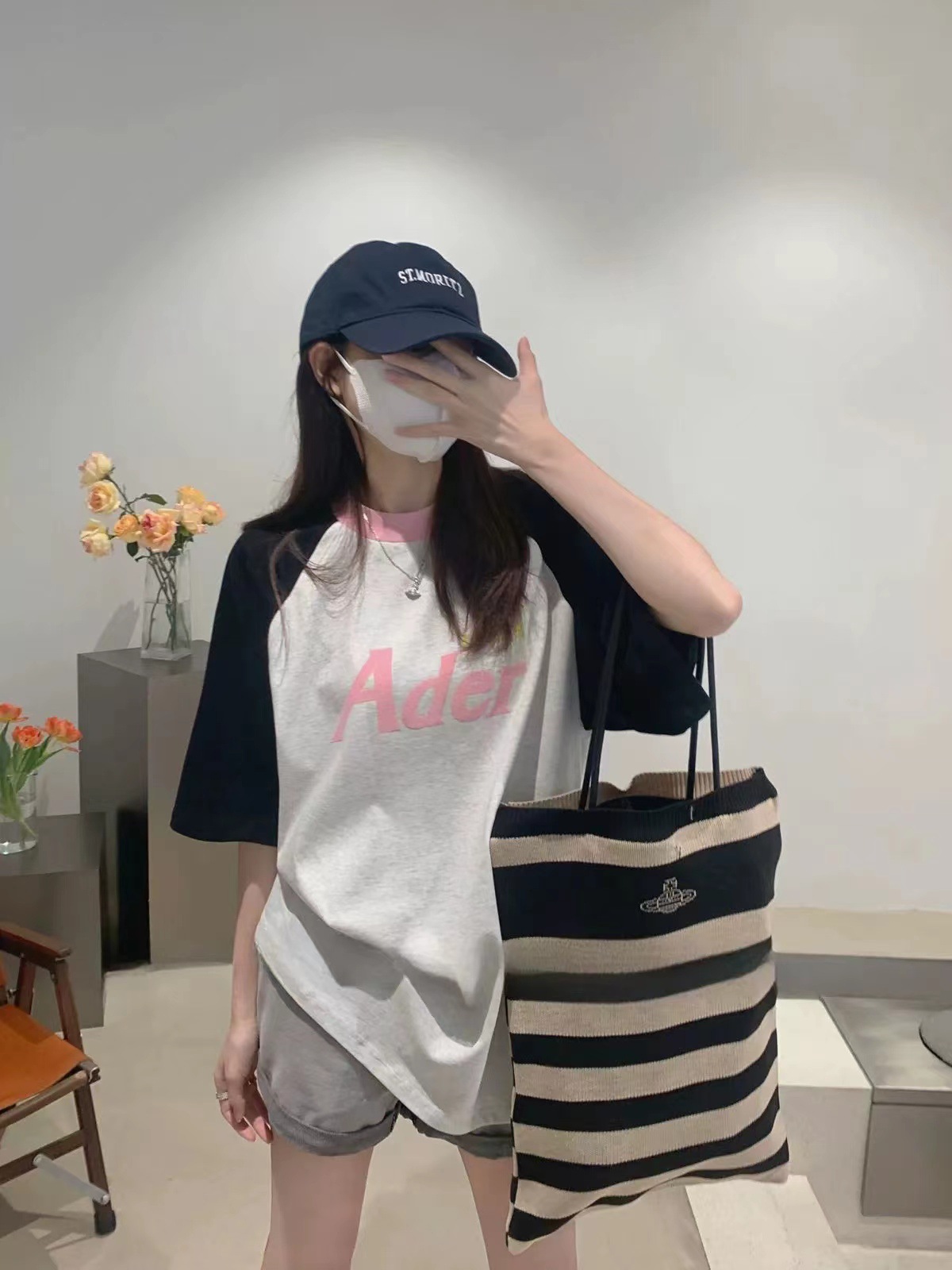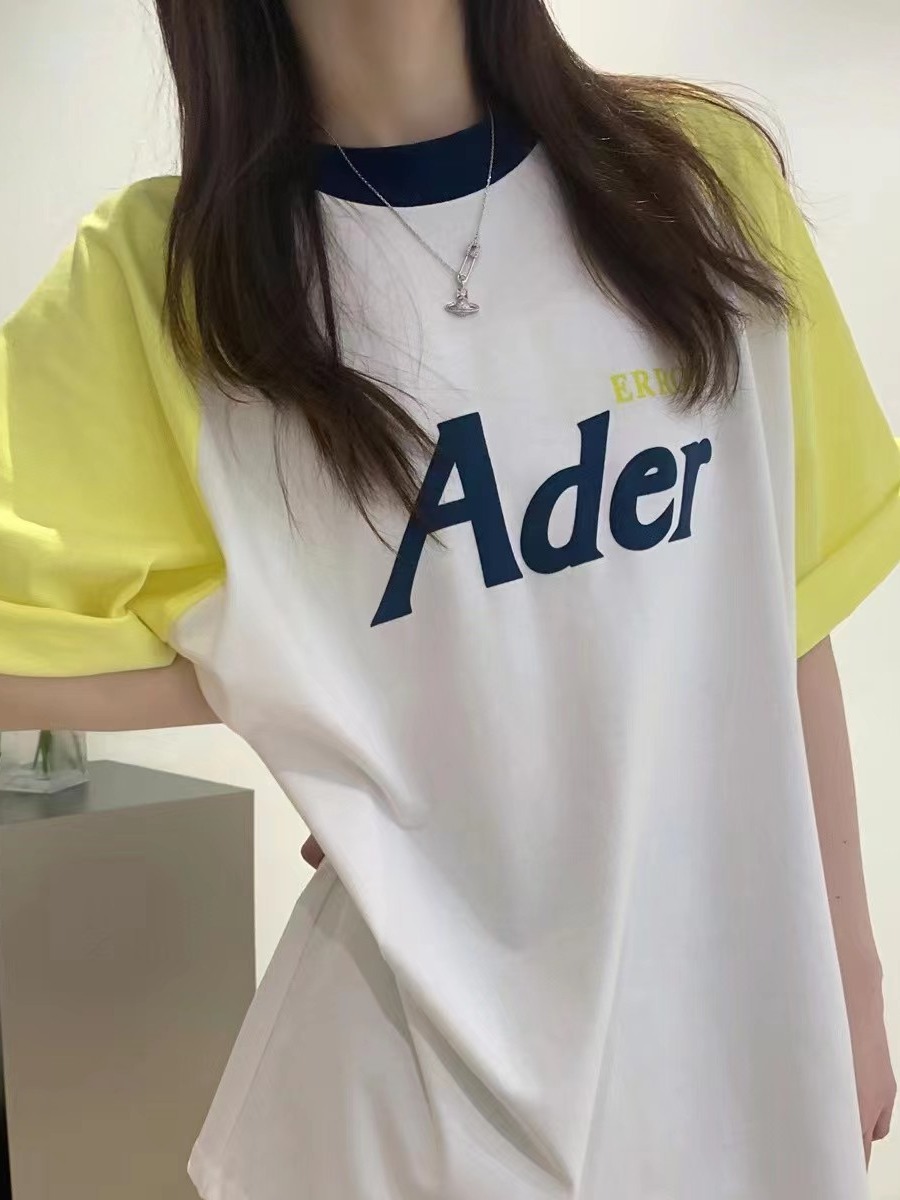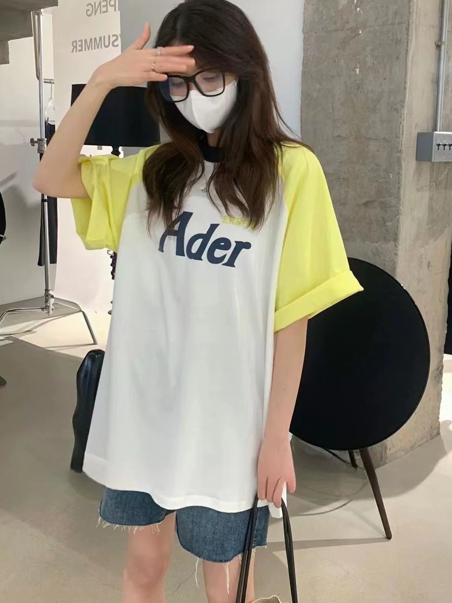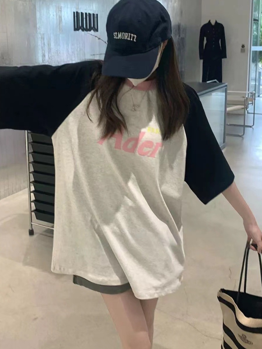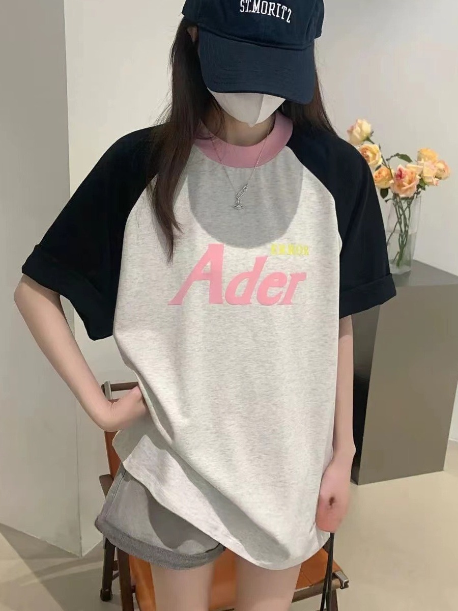 ADER短袖夏季宽松圆领字母植绒印花五分袖撞色拼接插肩袖T恤潮牌