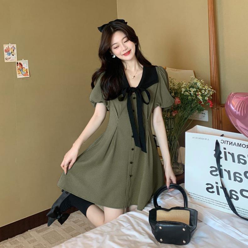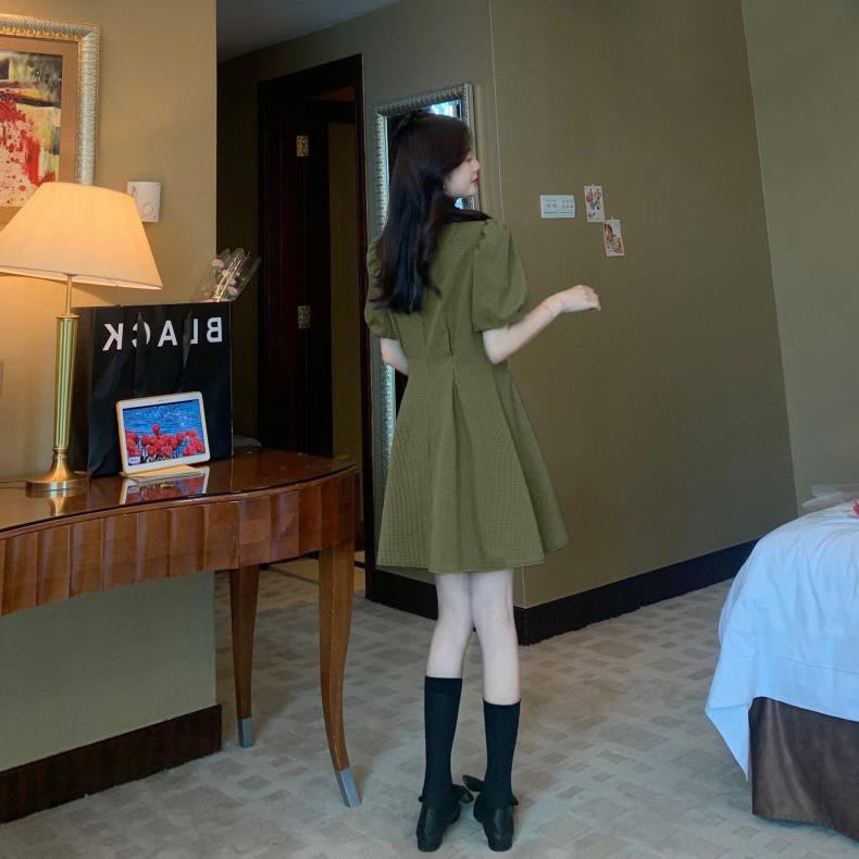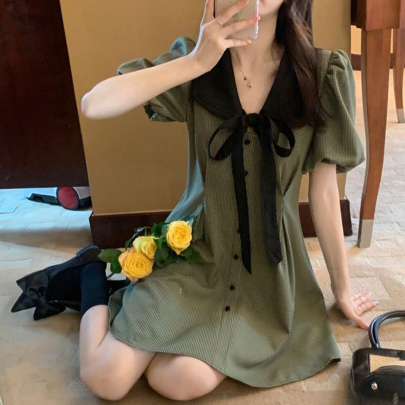 法式夏季气质泡泡袖绿色格子连衣裙子新款蝴蝶结小个子女装