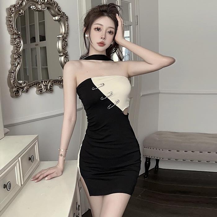 夏季新款小众纯欲辣妹撞色一字领拼接露肩开叉修身显瘦连衣短裙子