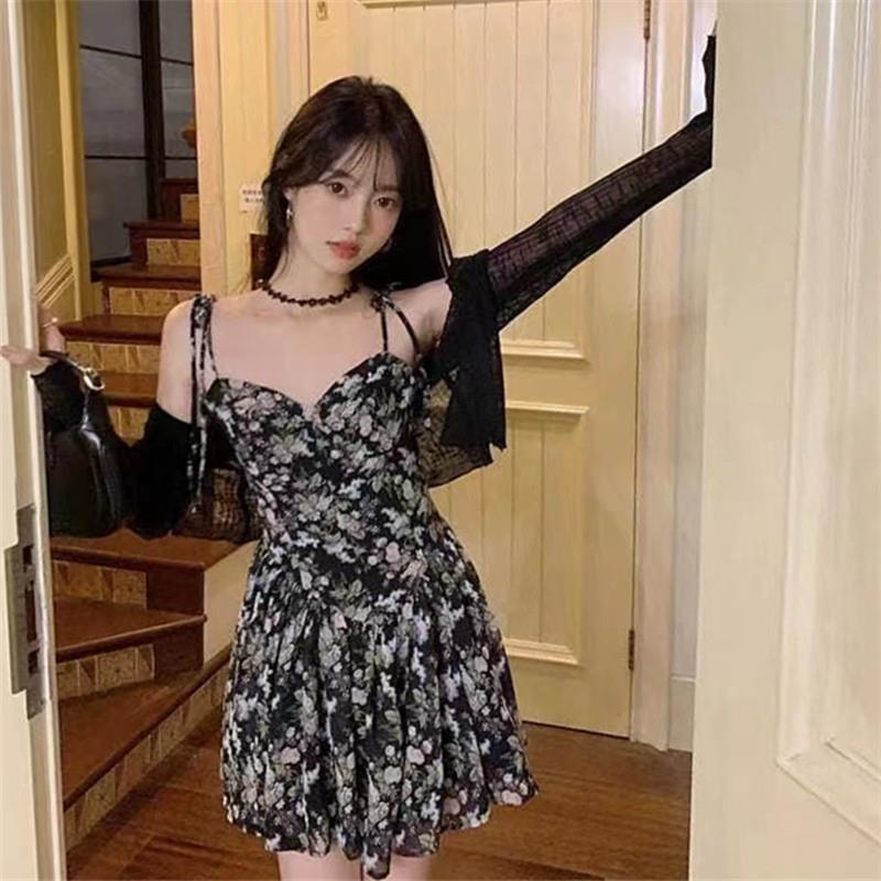 辣妹碎花吊带连衣裙女春夏新款法式绑带显瘦收腰甜辣性感短裙