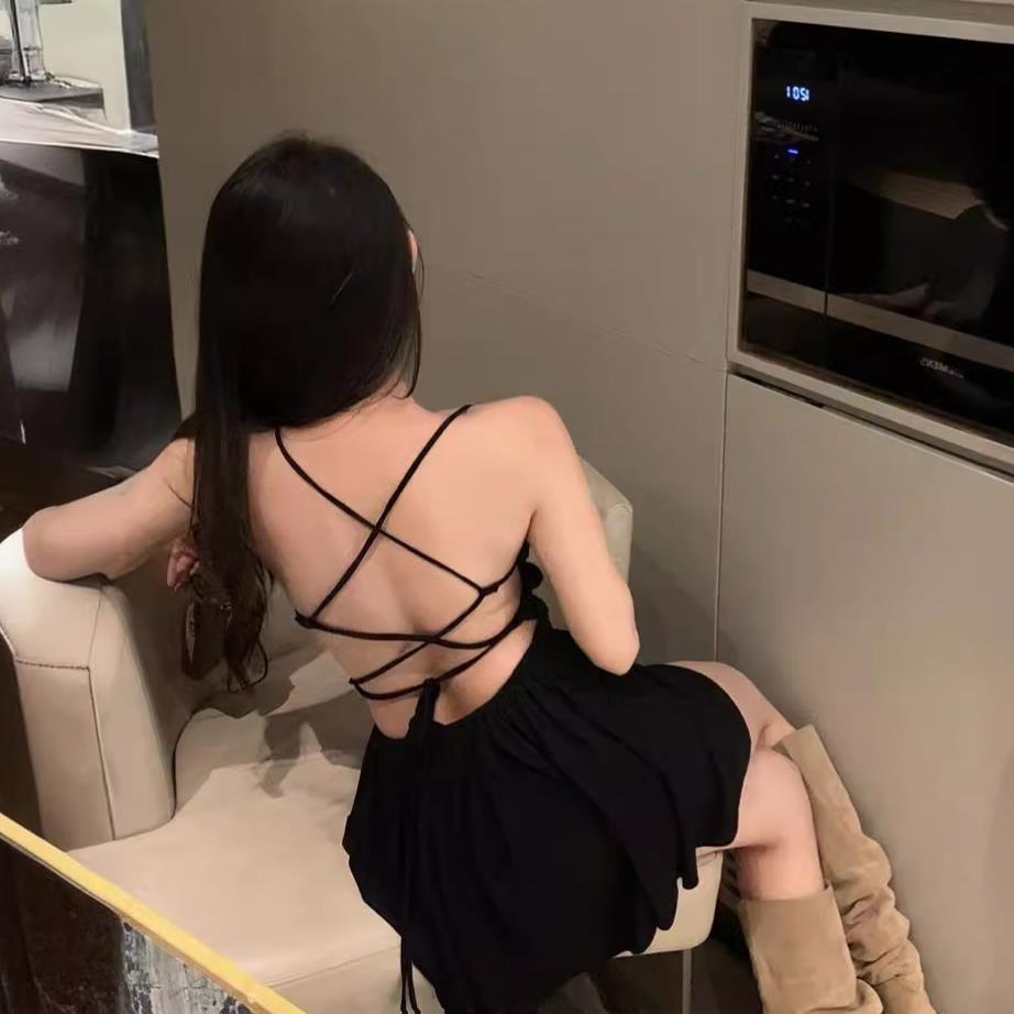 黑色露背吊带连衣裙女夏季无袖高腰开叉芭蕾风性感绑带百褶短裙子
