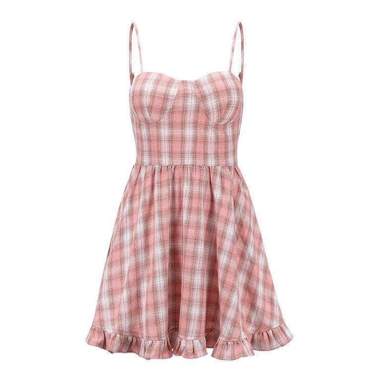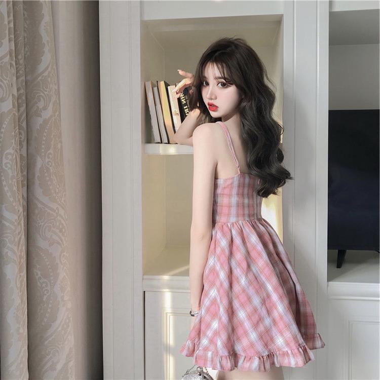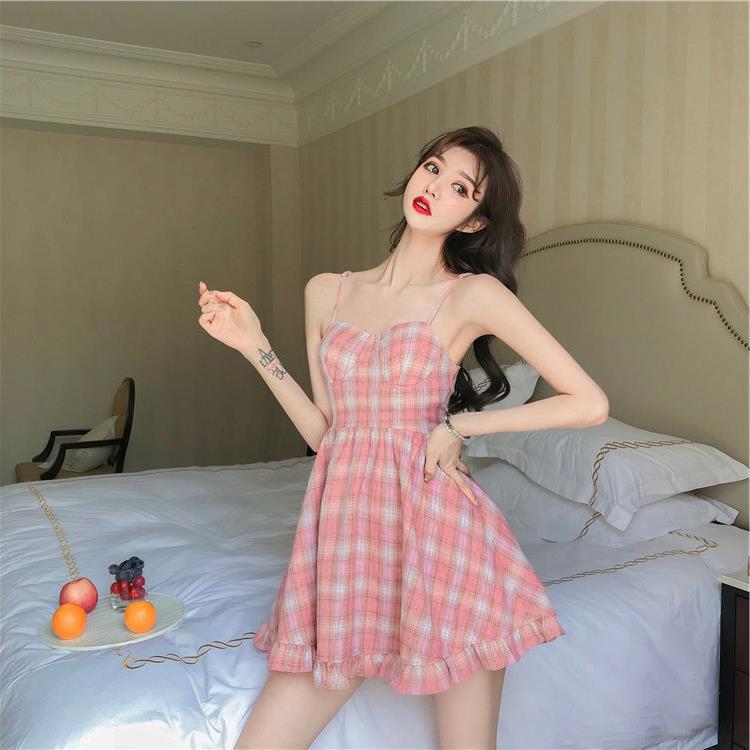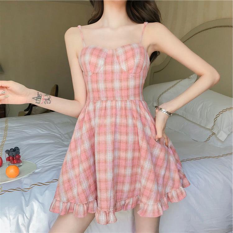 新款夏季甜美粉色格子吊带连衣裙女小清新学生裙子韩版少女装