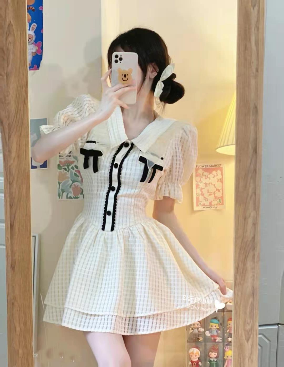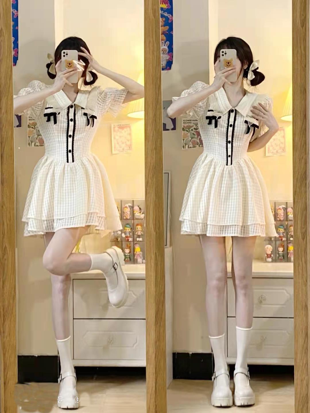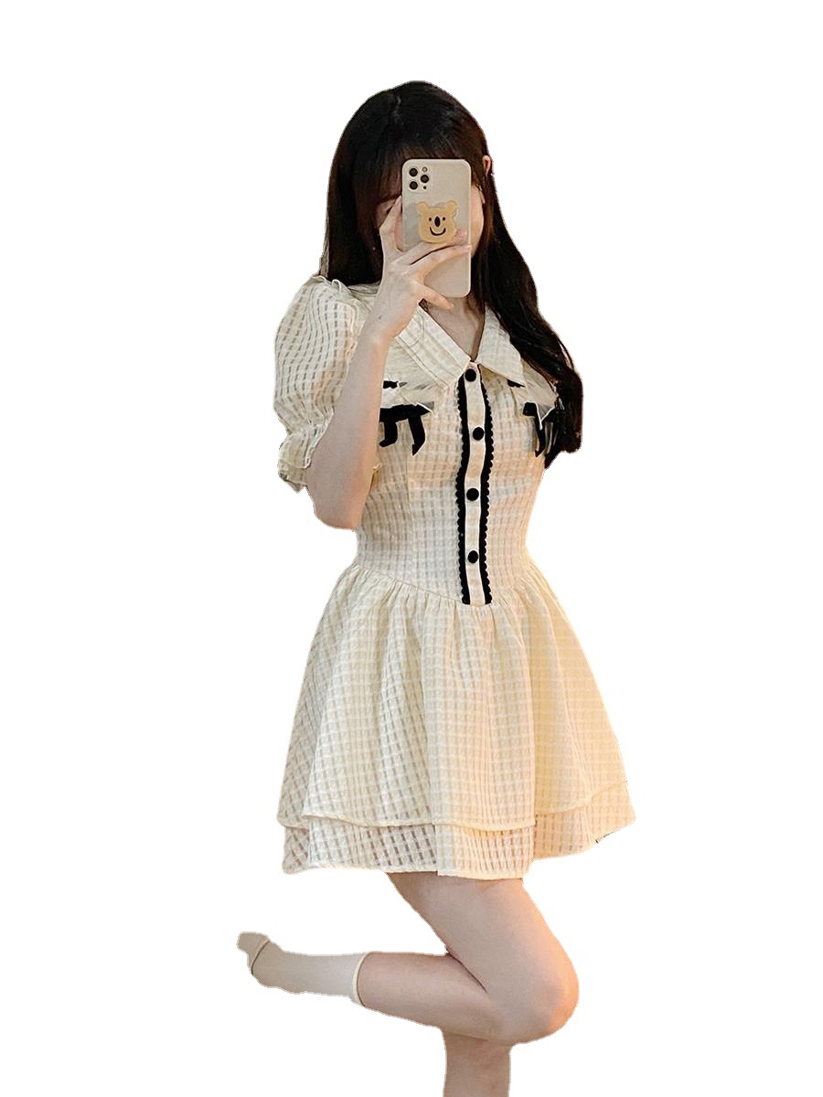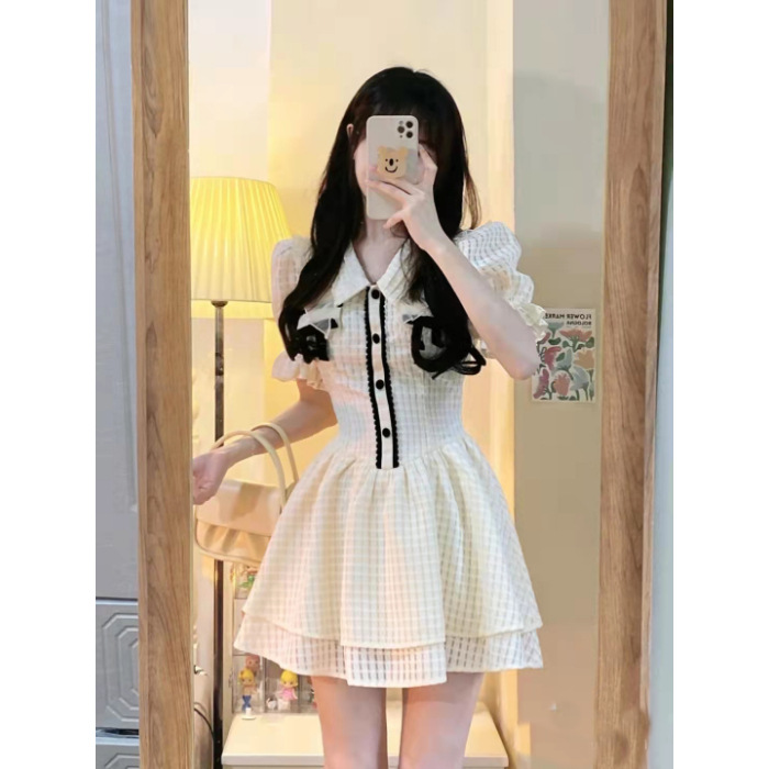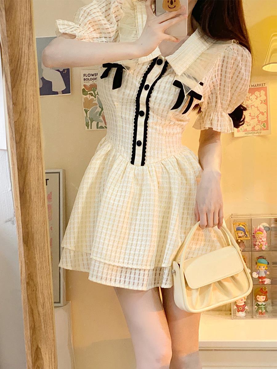 夏季新款绵绵冰格纹撞色蝴蝶结少女感连衣裙泡泡袖公主风初恋短裙