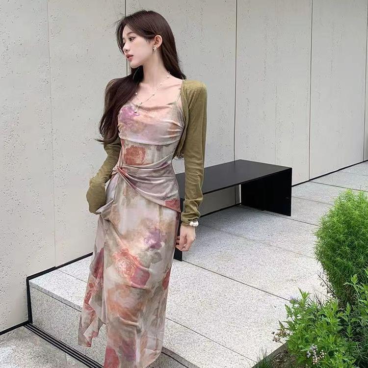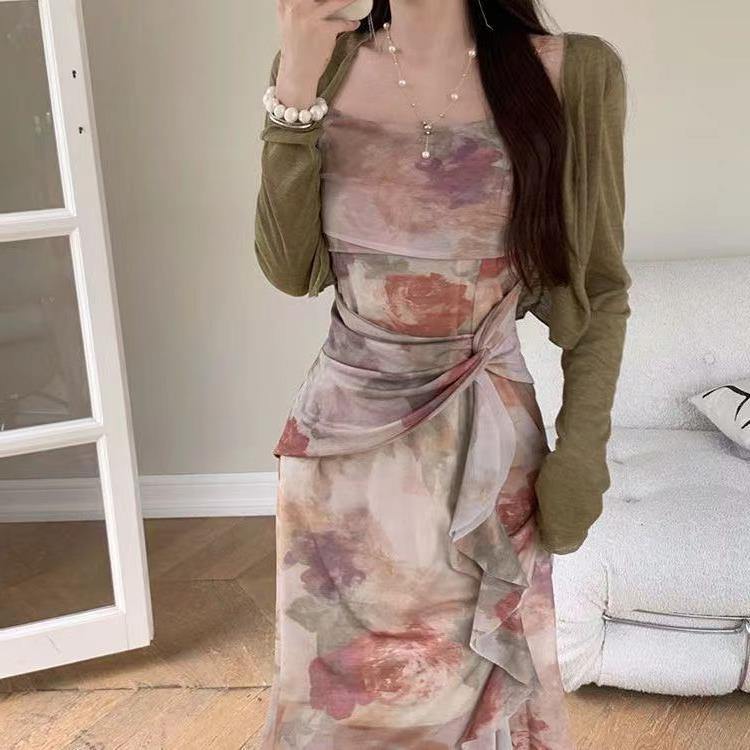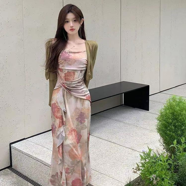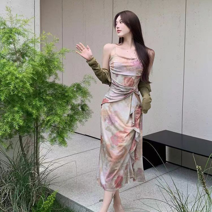 不规则法式纯欲吊带连衣裙女夏小众设计感性感碎花裙气质长裙子女