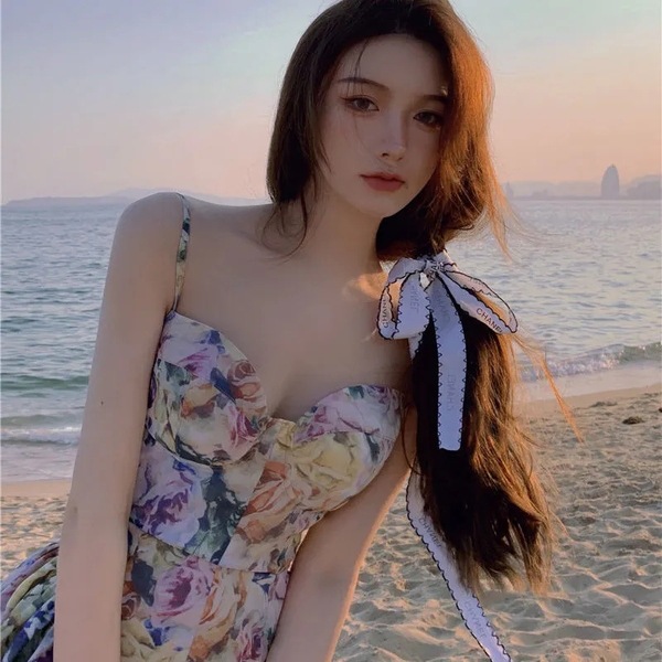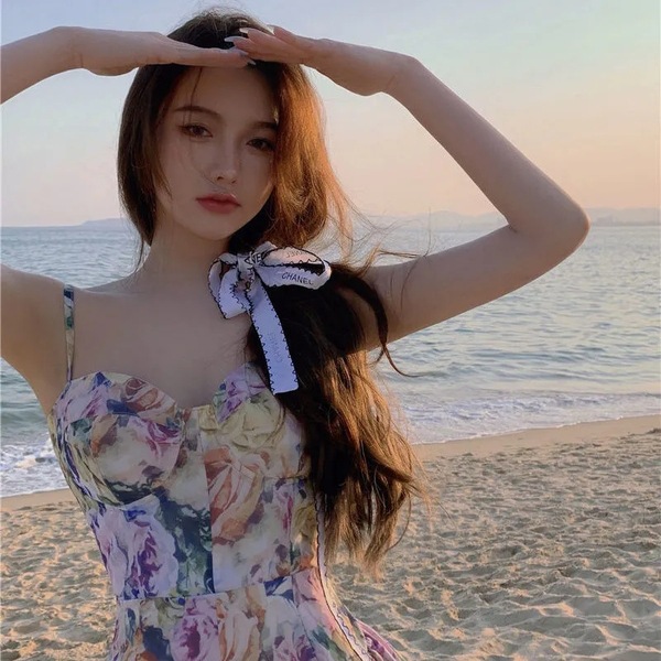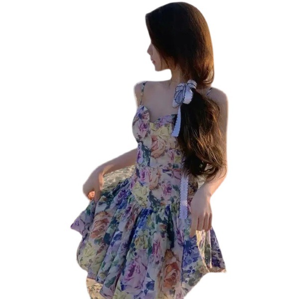 夏季新款法式吊带印花裙修身收腰显瘦短款裙子沙滩吊带连衣裙