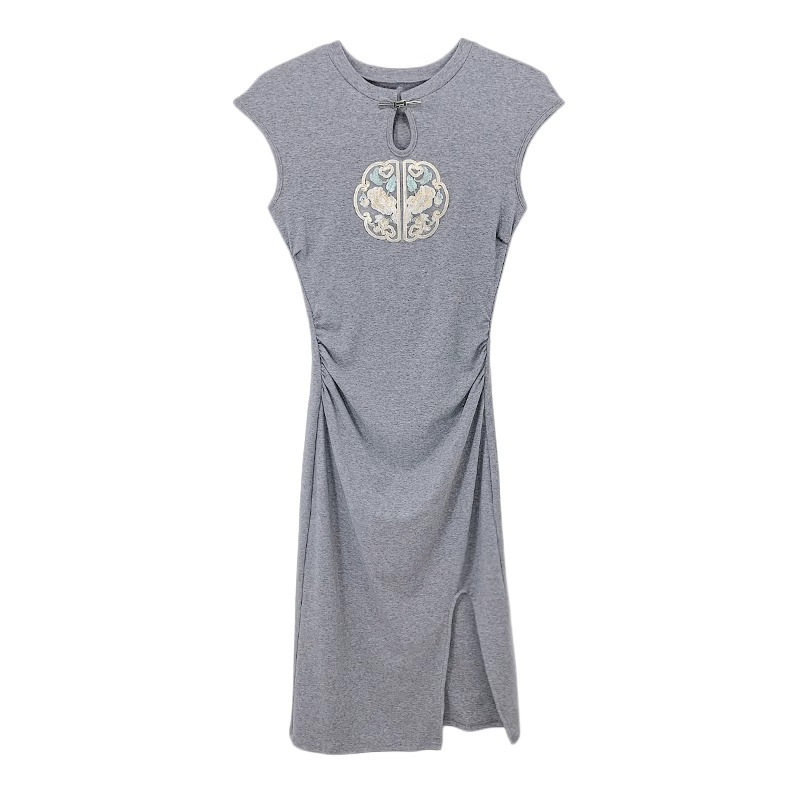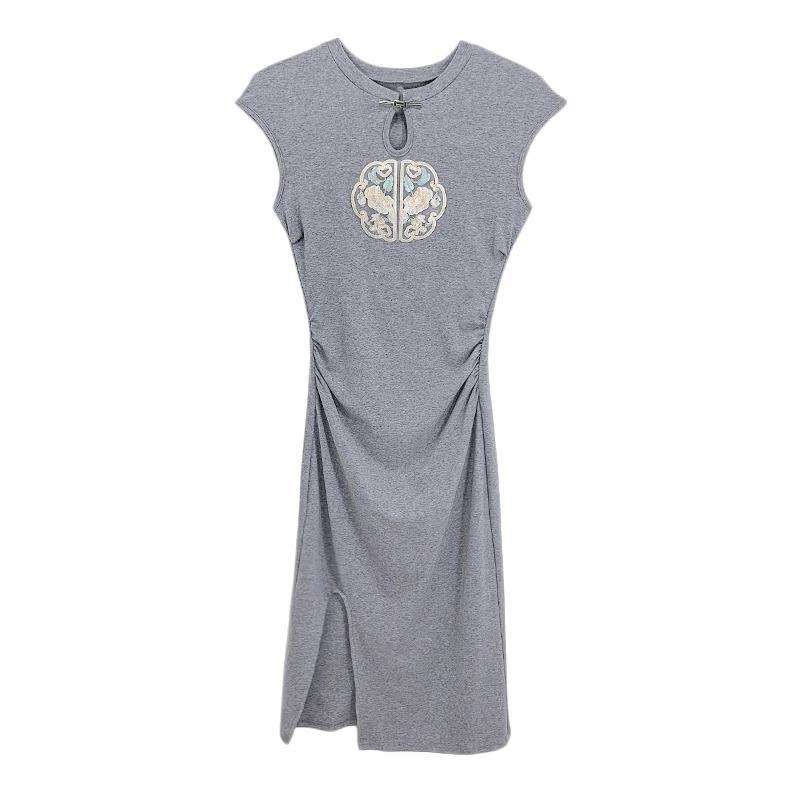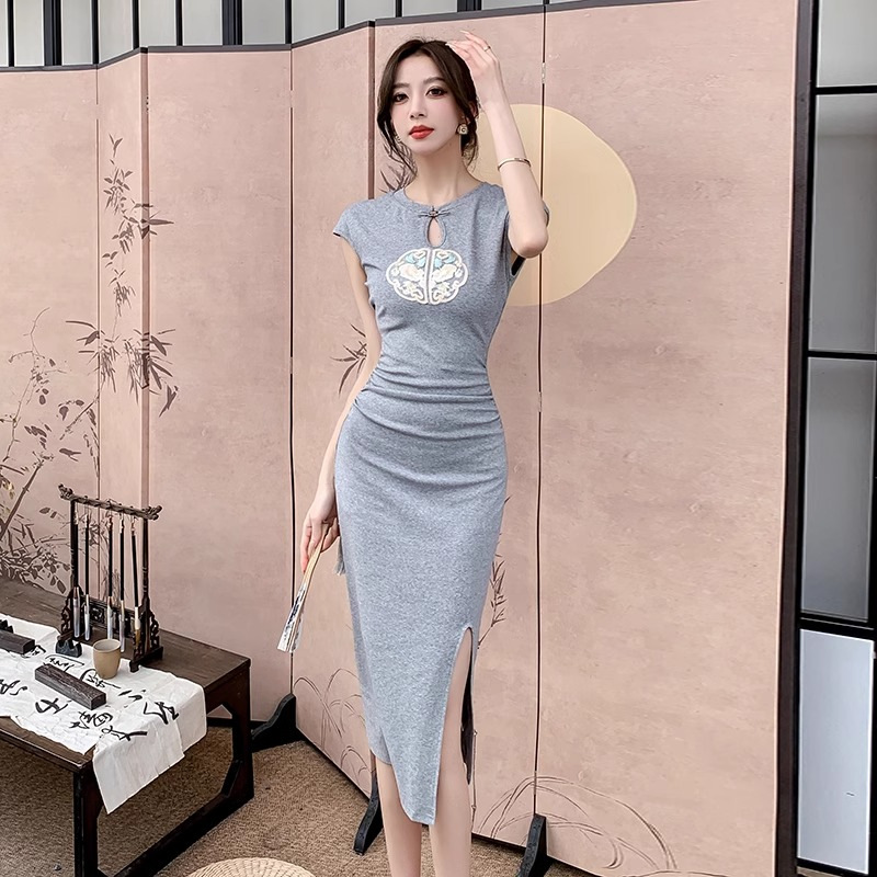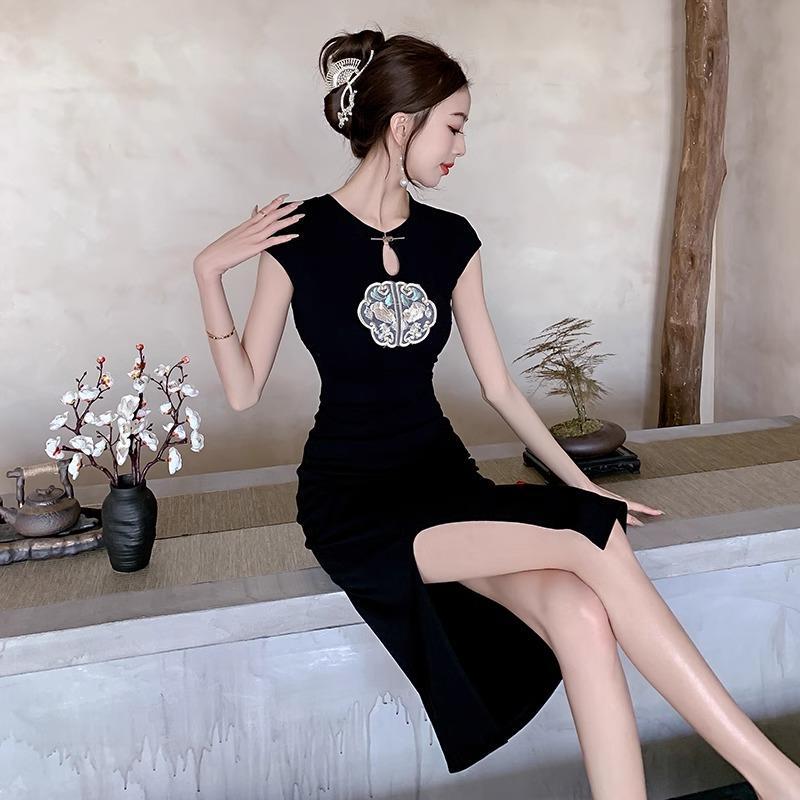 刺绣包袖连衣裙女夏设计感褶皱收腰开叉气质包臀中长裙